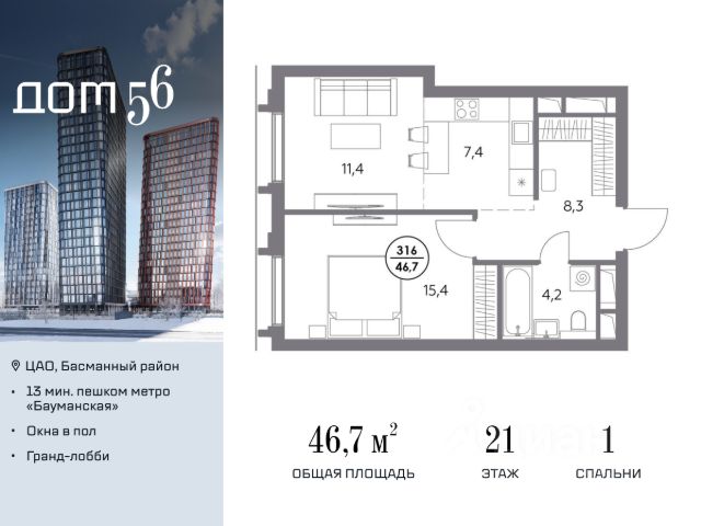 В премиум-квартале "Дом 56" на Бауманской напрямую от девелопера ГК "Галс-Девелопмент" представлена 1-комнатная квартира на 4 этаже общей площадью 47.60 м². Квартира предлагается без отделки, со свободной планировкой. Пространство позволяет воплотить дизайн - проект в соответствии с Вашими предпочтениями. "Дом 56" - расположен в Басманном районе на ул. Фридриха Энгельса, всего в 12-15 минутах пешком от станций метро "Бауманская" и "Электрозаводская". Рядом с премиум-кварталом находятся важные городские магистрали - ТТК, набережная реки Яузы и Бакунинская улица, переходящая в Спартаковскую и Маросейку. Архитектурный стиль "Дома 56" - параметрический минимализм. Футуристические фасады квартала с "эффектом закручивания" словно вращаются вокруг своей оси. Динамичный образ башен дополняет эффектное остекление - окна в пол будут в каждой квартире. "Дом 56" станет органичным продолжением современной научно-креативной среды Басманного района: - Развитое окружение - десятки различных точек притяжения; - Близость престижных вузов: МГТУ, МЭИ и Британская высшая школа дизайна; - Соседство с Технологической долиной и всем необходимым для запуска стартапа; - Набережные и парки для спорта и отдыха. "Дом 56" оснащён первоклассными инженерными системами. Входы на территорию, в здание и паркинг оборудованы системой контроля и управления доступом. С любого этажа в лобби и паркинг спускаются быстрые и бесшумные лифты премиального бренда. Во внутреннем приватном дворе будет создано пространство в бионическом стиле с лаунж-зонами, подвесными качелями, детскими плейхабами для разных возрастов, площадками для спорта и отдыха в окружении зелени. На двух подземных уровнях предусмотрен подземный паркинг и кладовые помещения.