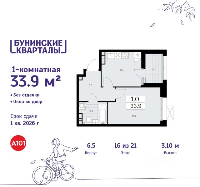 Продается однокомнатная квартира 546 в новостройке ЖК "Бунинские кварталы" по адресу Москва, ТиНАО, Новомосковский АО, Сосенское С/П, жилой комплекс Бунинские Кварталы, 6.5, район Коммунарка, Новомосковский административный округ, Москва. Общая площадь квартиры - 33.90 кв. м., этаж 16 из 21, секция 8. Тип проекта, по которому построен дом - монолит, компания-застройщик - ООО "А101". Стоимость квартиры - 14072907 Р. Срок сдачи - 1 квартал 2026. ПРЕДЛОЖЕНИЯ ОТ ЗАСТРОЙЩИКА В ФЕВРАЛЕ 2026: Скидки до 10% на все квартиры. Только в офисах продаж до 28 февраля. Ипотека от 13,9 % для всех! На весь срок. "Семейная ипотека" вернулась. Ставка от 3,5 % на весь срок! Без удорожания! Выгодное ипотечное комбо: Ипотека от 2200 р./мес. и от 6 % после рождения ребёнка! Ипотека для всех "Держи пять!" - ставка 5 % на 2 года! *более подробную информацию по скидкам и акциям уточняйте в отделе продаж ЖК "Бунинские кварталы" строится на юго-западе Москвы. Монолитные дома в лаконичной стилистике гармонируют с живописной природой. Из любой точки района удобно добираться до природных объектов, ключевых транспортных узлов, крупных торговых, спортивных, деловых и медицинских центров. Концепция уникального благоустройства района - "Выходи гулять!". Здесь появятся эстрада для районных творческих мероприятий, спортивные и игровые площадки, скейт-парк, дружелюбные пространства для домашних питомцев, благоустроенная набережная Ивановского пруда. В районе формируется собственная развитая инфраструктура: современные школа на 1100 мест и 2 детских сада на 540 малышей, магазины у дома и сетевые супермаркеты, фитнес, кафе, салоны, детские развивающие центры. Крытый каток "Самолёт Арена" - в 10 минутах пешком. За 15 минут можно дойти до действующей станции метро "Потапово". Предусмотрены удобные автомобильные выезды на проспект Куприна и улицу Александры Монаховой. Особенности "Бунинских кварталов": - ст. метро "Потапово" - 15 минут пешком - своя школа и детские сады - безопасные дворы без машин с системой контроля доступа - насыщенная инфраструктура - в шаговой доступности и на первых этажах домов
