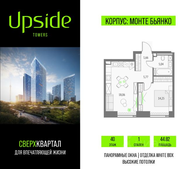 Продаётся 1-комнатная квартира площадью 39.7 кв.м на 48 этаже 55 этажного корпуса Эльбрус в квартале небоскребов "Upside Towers". В квартире отделка White-box, c видом на 2 очередь, прогулочный бульвар, парк Сокольники. Номер квартиры А4813. Upside Towers - технологичный квартал строится в динамично развивающемся Бутырском районе, в 3 мин. от метро, в 5 мин. от ТТК. На территории 7 га возводится 5 высотных башен от 19 до 58 этажей, названных в честь главных вершин земли. Квартиры с панорамными окнами в пол, высокими потолками и современными инженерными решениями. Благоустроенная зеленая территория включает: приватные дворы, природный комплекс, прогулочный бульвар, ландшафтный парк 2,5 га с сенсорным садом и многофункциональными игровыми и спортивными площадками. Большое внимание в проекте уделяется созданию социальной инфраструктуры. Более 2000 кв.м. отдано под Upside club закрытый клуб, уникальное пространство для общения и развития жителей квартала, включая SKY SPA Relax на 47 этаже башни "Атлас" расслабляющей атмосферой, джакузи, сауной, залами для релаксации и йоги доступное жителям Upside Towers, всесезонное барбекю-патио, лаундж зону с камином и роялем, многофункциональные игровые пространства, домашний кинотеатр, коворкинг и переговорные. В башнях откроются смотровые террасы для резидентов с панорамными видами на город, парки, Останкинскую башню, ВДНХ, Ботанический сад и Москву-Сити. В рамках проекта строится государственная школа и детский сад, разместится более 15 000 кв.м. коммерческой инфраструктуры. Насыщенная социальная инфраструктура формирует множество сценариев для жизни на территории квартала. В Upside Towers применяются лучшие технологии и практики, чтобы обеспечить высшее качество жизни: Воздух, не уступающий по качеству горному, обеспечит приточно-вытяжная вентиляция. Пятиступенчатая очистка воды с сохранением полезных минералов. Центральное кондиционирование. Внутрипольные конвекторы с естественной конвекцией. Современные системы безопасности и мониторинга микроклимата. Высокоскоростной интернет на всей территории, в квартирах и паркинге за счет усиления GSM-связи всех ведущих операторов. Все места в подземном паркинге оборудованы зарядками для электрокаров. Бутырский район непрерывно развивается и готовится стать новым современным деловым районом Москвы. В рамках программы "Индустриальные кварталы" комплексного развития территории Огородного проезда будут построены современные образовательные и спортивные учреждения, торговые центры, кафе, банки, общественно-деловые здания и другие объекты. В пешей доступности работают школы, детские сады, поликлиники, аптеки, супермаркеты и многое другое. Рядом находится несколько крупных зелёных зон для спокойного отдыха: Парк Останкино, ВДНХ, Парк Сокольники, Гончаровский парк, в 15 минутах пешком располагаются знаменитые арт-пространства - дизайн-завод Flacon и "Хлебозавод". Время в пути на автомобиле до центра Москвы 15 минут. (Застройщик ООО "СЗ "К-Девелопмент")