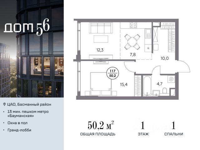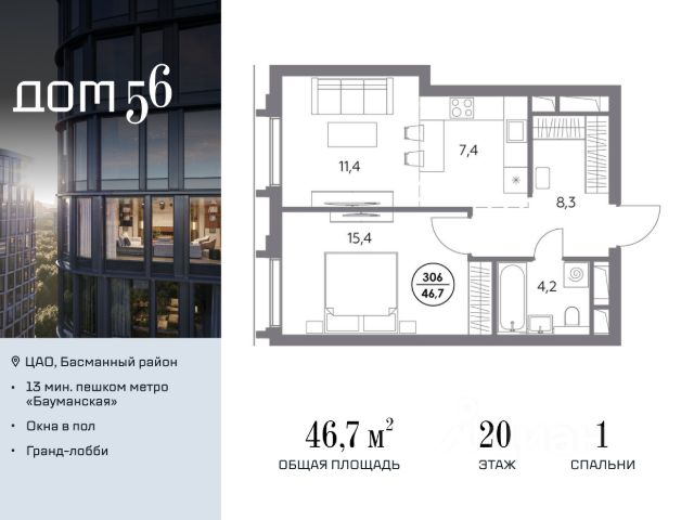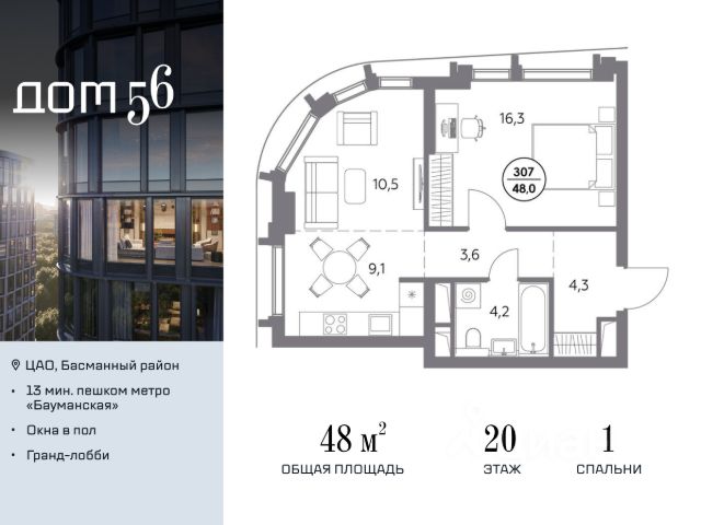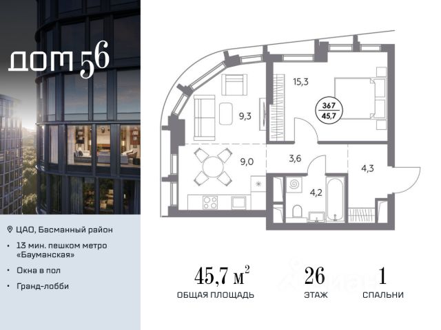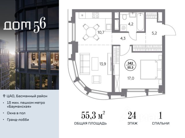 В премиум-квартале "Дом 56" на Бауманской напрямую от девелопера ГК "Галс-Девелопмент" представлена 1-комнатная квартира на 24 этаже общей площадью 55.30 м². Квартира предлагается без отделки, со свободной планировкой. Пространство позволяет воплотить дизайн - проект в соответствии с Вашими предпочтениями. "Дом 56" - расположен в Басманном районе на ул. Фридриха Энгельса, всего в 12-15 минутах пешком от станций метро "Бауманская" и "Электрозаводская". Рядом с премиум-кварталом находятся важные городские магистрали - ТТК, набережная реки Яузы и Бакунинская улица, переходящая в Спартаковскую и Маросейку. Архитектурный стиль "Дома 56" - параметрический минимализм. Футуристические фасады квартала с "эффектом закручивания" словно вращаются вокруг своей оси. Динамичный образ башен дополняет эффектное остекление - окна в пол будут в каждой квартире. "Дом 56" станет органичным продолжением современной научно-креативной среды Басманного района: - Развитое окружение - десятки различных точек притяжения; - Близость престижных вузов: МГТУ, МЭИ и Британская высшая школа дизайна; - Соседство с Технологической долиной и всем необходимым для запуска стартапа; - Набережные и парки для спорта и отдыха. "Дом 56" оснащён первоклассными инженерными системами. Входы на территорию, в здание и паркинг оборудованы системой контроля и управления доступом. С любого этажа в лобби и паркинг спускаются быстрые и бесшумные лифты премиального бренда. Во внутреннем приватном дворе будет создано пространство в бионическом стиле с лаунж-зонами, подвесными качелями, детскими плейхабами для разных возрастов, площадками для спорта и отдыха в окружении зелени. На двух подземных уровнях предусмотрен подземный паркинг и кладовые помещения.