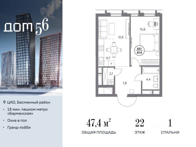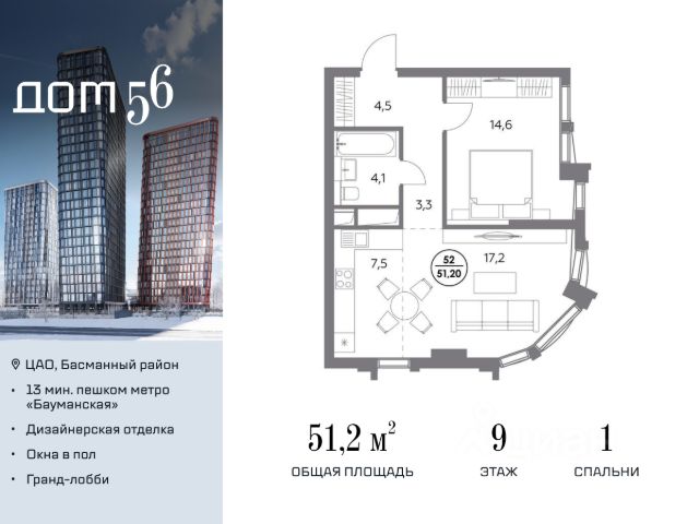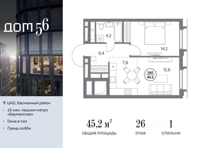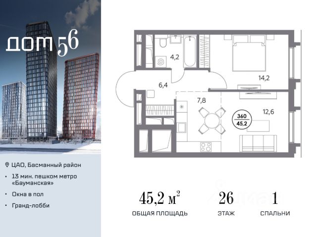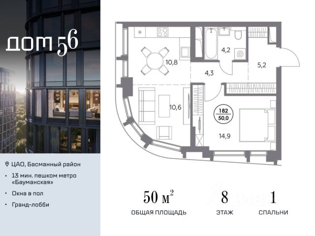 В премиум-квартале "Дом 56" на Бауманской напрямую от девелопера ГК "Галс-Девелопмент" представлена 1-комнатная квартира на 2 этаже общей площадью 48.70 м². Квартира предлагается без отделки, со свободной планировкой. Пространство позволяет воплотить дизайн - проект в соответствии с Вашими предпочтениями. "Дом 56" - расположен в Басманном районе на ул. Фридриха Энгельса, всего в 12-15 минутах пешком от станций метро "Бауманская" и "Электрозаводская". Рядом с премиум-кварталом находятся важные городские магистрали - ТТК, набережная реки Яузы и Бакунинская улица, переходящая в Спартаковскую и Маросейку. Архитектурный стиль "Дома 56" - параметрический минимализм. Футуристические фасады квартала с "эффектом закручивания" словно вращаются вокруг своей оси. Динамичный образ башен дополняет эффектное остекление - окна в пол будут в каждой квартире. "Дом 56" станет органичным продолжением современной научно-креативной среды Басманного района: - Развитое окружение - десятки различных точек притяжения; - Близость престижных вузов: МГТУ, МЭИ и Британская высшая школа дизайна; - Соседство с Технологической долиной и всем необходимым для запуска стартапа; - Набережные и парки для спорта и отдыха. "Дом 56" оснащён первоклассными инженерными системами. Входы на территорию, в здание и паркинг оборудованы системой контроля и управления доступом. С любого этажа в лобби и паркинг спускаются быстрые и бесшумные лифты премиального бренда. Во внутреннем приватном дворе будет создано пространство в бионическом стиле с лаунж-зонами, подвесными качелями, детскими плейхабами для разных возрастов, площадками для спорта и отдыха в окружении зелени. На двух подземных уровнях предусмотрен подземный паркинг и кладовые помещения.