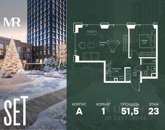 Прямая продажа от застройщика. В ЖК SET продается 1-комнатная квартира площадью 31.05 м², расположенная в корпусе Б, на 53 этаже 59 этажного дома. SET имеет стратегически выгодное расположение в ЗАО, в районе с большой историей и блестящим будущим: между природной зоной долины реки Сетунь и Кутузовским проспектом. В рамках возведения первой очереди предусмотрено три корпуса высотой 18, 45 и 59 этажей. На верхних этажах спроектированы общедоступные смотровые площадки с панорамным обзором на центр столицы. Преимущества проекта: • Функциональные планировочные решения • Контроль проникновения через входную дверь • Система управления освещением и температурой в квартире • Система защиты от протечек с функцией перекрытия воды • Вход в подъезд по биометрическим считывателям Face ID • Скоростные лифты • Двухуровневый подземный охраняемый паркинг на 495 машино-мест Застройка SET включает в себя не только жилые корпуса, но и инфраструктурные объекты. Все необходимое для повседневного комфорта будет расположено в шаговой доступности: • Фитнес-клуб с бассейном • Ведущая городская школа, детский сад и школа искусств • Центр культуры и досуга • Медицинский центр • Кафе и рестораны Расположение комплекса: Пешком: • Метро "Давыдково" - 17 минут • Парк "Долина реки Сетунь" - 3 минуты • Открытие новых станций метро в шаговой доступности в будущем Инфраструктура: Разнообразить свой день резиденты VEER смогут также проводя больше времени на свежем воздухе. Двор разделен на 4 зоны разных эмоций и действий, которые пересечены и соединены веерными прогулочными маршрутами: • Спортивная площадка устроена в глубине ""Кленовой рощи"" • В ""Чайном домике"" будет создан навес с утеплением для отдыха в любую погоду • Площадки для детей воплотятся в ""Волшебный лес"" с цветами, зеркалами и световым дизайном • ""Центральная площадь"" устроена у водного оазиса живописного пруда. " На машине: • "Москва-Сити" - 15 минут • Садовое кольцо - 20 минут • ТЦ "Океания" - 8 минут • ТЦ "Времена года" - 13 минут • Сколково - 12 минут • Гребной канал - 17 минут Компания MR предлагает своим клиентам специальные условия приобретения квартир в рамках программ ипотечного кредитования от банков-партнеров.