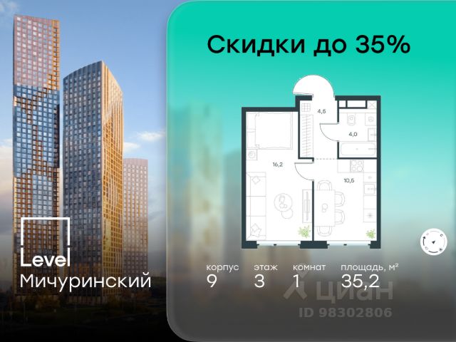 Цена указана с учётом скидки при 100%-й оплате, несубсидированной ипотеке, рассрочке (кроме программы "Рассрочка 0%"). В жилом квартале, расположенном на границе с природным заказником "Долина реки Очаковки", продаётся 1-комнатная квартира площадью 37.90 кв.м без отделки. Квартира расположена на 3 этаже 24-этажного корпуса 11 в жилом комплексе бизнес-класса Level Мичуринский (компания Level Group/Левел групп). Отличная транспортная доступность - 10 мин. пешком до станции метро "Мичуринский проспект" - 15 мин. пешком до станции метро "Аминьевская" - 7 мин. на авто до МКАД - 10 мин. на авто до ТТК - 15 мин. на авто до Москва-Сити Продуманный архитектурный проект - Выразительная архитектура от известных бюро: корпуса 1-6 - СПИЧ, корпуса 7-13 - Borisov Architects; - Из окон открываются живописные виды на парки, Москва-Сити и МГУ; - Высокие потолки до 6,35 м; - Стильные лобби с окнами в пол и высокими потолками до 4,7 м; - С каждого этажа дома на лифте можно спуститься в подземный отапливаемый паркинг. Расположение Level Мичуринский строится в одном из самых зеленых районов Москвы - Очаково-Матвеевское. Этот уголок столицы идеален для поддержания здорового образа жизни. В шаговой доступности от проекта находятся заказник "Долина реки Очаковки" - 1 мин. пешком и Очаковский парк - 7 мин. пешком. На велосипеде можно добраться до таких парков, как "Событие", парк Олимпийской деревни, парк 50-летия Октября и парк Школьников. В 15-минутной доступности на авто расположено более 30 детских садов (из них 14 в пешей доступности), 32 школы (из них 13 в пешей доступности) и 14 вузов. В ближайшем окружении работает более 25 медицинских учреждений, 11 спортивных клубов и 22 продуктовых супермаркета. Внутренняя инфраструктура На территории жилого комплекса строится три детских сада и школа. На первых этажах домов откроется супермаркет, фитнес-центр, ресторан, кафе и другие сервисы. Подземные этажи займут паркинги: трехуровневые в этапах 1 и 2, одноуровневый в этапах 3 и 4. Преимущества проекта - 4,5 га благоустроенной территории с видовым мостом, уличным кинотеатром, зонами для тихого отдыха, работы, воркаута, площадки для петанка, футбола, настольного тенниса и пляжного волейбола; - Дизайнерские лобби с панорамным видом на двор, мойками для лап животных и комфортными зонами ожидания. - Безопасность жителей: круглосуточное видеонаблюдение всех зон общего пользования (лобби, лифты, паркинги, детские площадки), система контроля доступа, управление видеодомофоном через мобильное приложение, единый ключ доступа на территорию жилого комплекса. - Технологии и комфорт: высокоскоростной Wi-Fi в лобби и на придомовой территории, автоматическая система контроля и учета ресурсов, абонентская связь с консьержем, распознавание номеров автомобилей при въезде/выезде в/из паркинга.