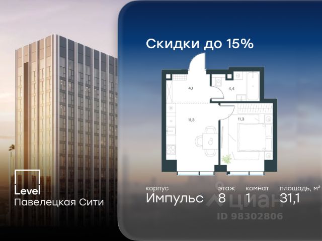 Цена указана с учётом скидки при 100%-й оплате, несубсидированной ипотеке, рассрочке (кроме программы "Рассрочка 0%"). В Даниловском районе столицы (ЮАО) продаётся 1-комнатная квартира площадью 30.20 кв.м без отделки. Квартира расположена на 31 этаже 45-этажного корпуса 'Горизонт' в жилом комплексе бизнес-класса Level Павелецкая Сити. Высота потолков 3.00м. Престижная локация "Level Павелецкая Сити" - это жилой комплекс бизнес-класса, расположенный в престижном Даниловском районе Москвы - историческом центре города в окружении парков, Москвы-реки и новейшей инфраструктуры. В 20 минутах пешком есть 3 станции метро, а в 5 минутах езды на авто - ТТК и Садовое кольцо. - 15 мин. пешком до метро "Павелецкая"; - 20 мин. пешком до станций "Тульская" и "Серпуховская"; - 8 мин. на авто до Кремля; - 10 мин. на авто до парка Горького и парка "Зарядье"; - 20 мин. на авто до башен "Москва-Сити". Авторская архитектура Авторская архитектурная концепция разработана бюро СПИЧ. Облик корпусов I и II очередей отсылает к стилистике архитектуры классического Нью-Йорка и золотой эпохи Голливуда. Корпуса IV очереди вдохновлены эстетикой ар-деко. Умное линейное расположение корпусов гарантирует потрясающие виды на исторический центр и Москву-реку из большинства квартир. Дизайнерские лобби Изысканные интерьеры лобби жилого комплекса отсылают к классическим фильмам золотой эпохи Голливуда. Классика в "Level Павелецкая Сити" - не имитация, а современное осмысление лучшего в этом стиле. В каждом вестибюле оборудованы стойки ресепшен, комфортные зоны ожидания, гостевые санузлы, мойки для лап животных, колясочные. В корпусах по 3-4 лифта с прямым доступом в паркинг. Площадь лобби - от 47,9 до 114,9 кв. м, высота потолков - до 5,46 м. Благоустройство и инфраструктура Для создания благоустройства было приглашено 2 ведущих бюро - ADM и GAFA. Разноуровневое пространство вмещает в себя игровые площадки для детей всех возрастов, тропы здоровья для пеших прогулок, крытые аллеи с качелями, места для работы на свежем воздухе, многофункциональные спортивные площадки - воркаут-зоны, столы для пинг-понга, зоны командных игр. Общая площадь закрытого двора - 4,63 га. Комфорт - это когда рядом всё, что нужно для жизни. На первых этажах и в стилобатной части корпусов "Level Павелецкая Сити" размещены 85 коммерческих помещений, где откроются супермаркеты, кафе, аптеки и многое другое. В составе проекта также предусмотрены собственный фитнес-клуб, развивающий центр Letovo Kids, школа на 720 мест и детский сад на 175 мест. Технологии и безопасность - Wi-Fi в лобби и на придомовой территории; - Автоматизированная система контроля и учета ресурсов; - Круглосуточное видеонаблюдение и охрана; - Круглосуточная связь с охраной через приложение, телефон или кол-центр; - Контроль доступа по биометрической системе Face-ID; - Усиленный сотовый сигнал в лифтах и паркинге; - Распознавание номеров автомобилей при въезде/выезде в/из паркинга.