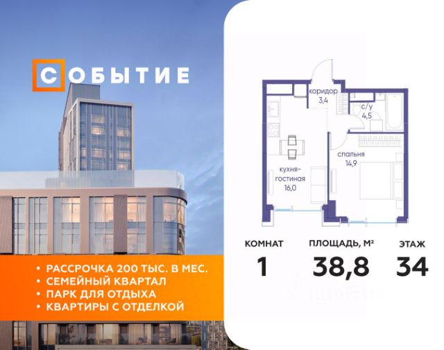 В продаже 1-к квартира от застройщика. Общая площадь 45.70, жилая 16.60, кухня 18.2. Квартира расположена на 13 этаже жилого квартала "Событие-6", корпус 1, Секция 1. Квартира без отделки. Срок сдачи: 4 кв. 2029 года. СОБЫТИЕ.6 — финальный дом парк-квартала СОБЫТИЕ на Мосфильмовской. Переезжайте в уже сформированный квартал с готовой инфраструктурой и парком! Премиальный жилой комплекс в престижном районе Москвы предлагает стильную архитектуру, продуманное благоустройство и великолепно разнообразие общественных пространств. Свой парк прямо возле дома! Архитектура Архитектура СОБЫТИЯ.6 выполнена в ультрасовременном стиле московским бюро Atrium на основе дизайн-кода британских архитекторов LDA Design и UHA London. Дом отличает оригинальная геометрия фасадов, большое остекление и высокие лобби (до 6,2 м) с авторской мебелью и светильниками. Расположение Мосфильмовская улица (Раменки) — один из престижных районов Москвы. Близость к историческому и деловому центру, природным зонам Запада столицы. Транспортная доступность: • 10 мин до Москва-Сити и ТТК; • 15 мин до Садового кольца; • 25 мин до аэропорта Внуково; • 7-10 мин до станций метро "Аминьевская" и "Мичуринский проспект". Инфраструктура: • парк "Событие" (12 га, финалист конкурса Правительства Москвы) с беговыми (1,5 км) и велодорожками (2,7 км), экотропой (1,6 км), площадками, лекторием; • школа, детский сад, магазины, салоны красоты, рестораны (к моменту заселения); • мультидвор с игровыми и спортивными площадками, мини-бульваром; • общественная терраса на 10-м этаже (коворкинг, лаунж); • Закрытые общественные пространства: детская комната, спортивный зал, коворкинг, лаунж-зоны. Паркинг 256 мест для жителей (48 — для электромобилей), 24 гостевых (5 — для электромобилей), мойки колес, кладовые, зоны для велосипедов. Окружение Парки и заповедники (Воробьёвы горы, Матвеевский лес и др.), МГУ, театр им. Н. И. Сац, стадион "Лужники". Безопасность Видеонаблюдение, контроль доступа, видеодомофоны, консьерж-сервис 24/7, системы пожарной безопасности и мультисервисная оптическая сеть.
