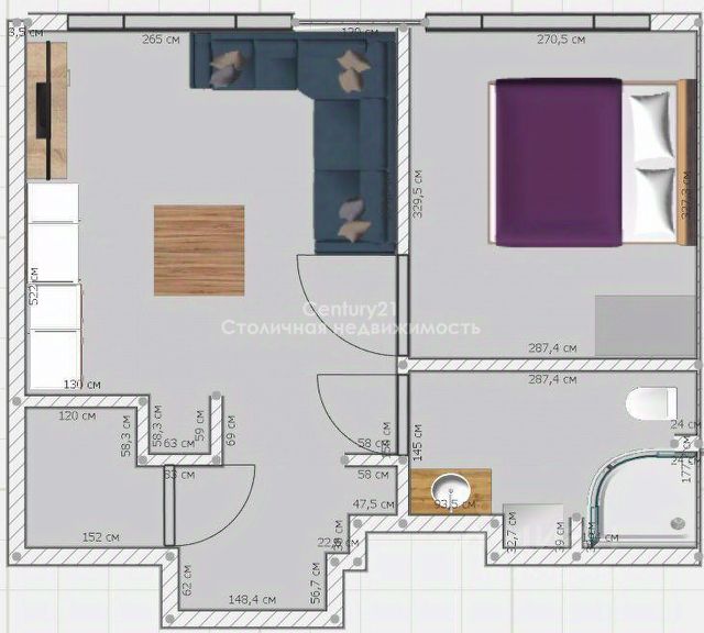 коридор с гардеробной, нишами для встроенных шкафов, просторная кухня - гостиная, изолированная спальня. санузел с душевой.