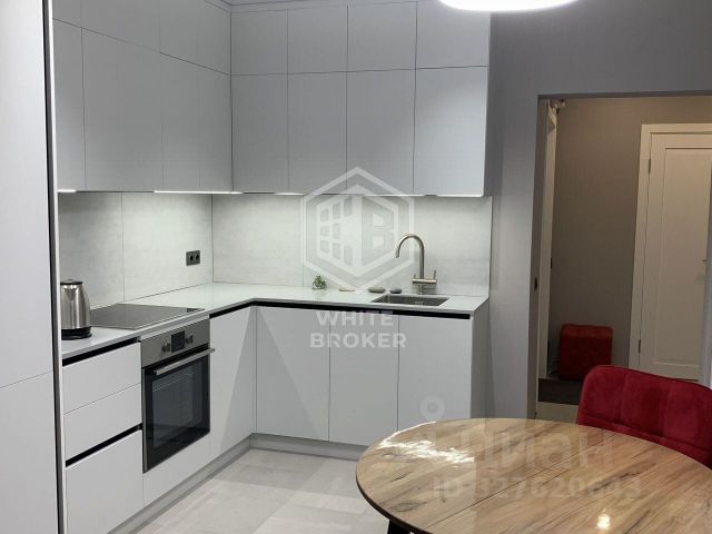 Кухня укомплектована современной мебелью, варочный панелью, духовым шкафом, посудомоечной машиной, холодильником и микроволновой печью.