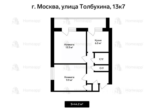 Функциональная планировка: прихожая, гостиная — 13,3 м², спальня — 9,9 м², удобная кухня квадратной планировки — 6 м², с/у раздельный, большая лоджия — 6 м².