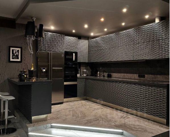 Кухня-гостиная с техникой Miele (посудомойка, духовой шкаф, вытяжка, микроволновка), диван, обеденный стол, телевизор.