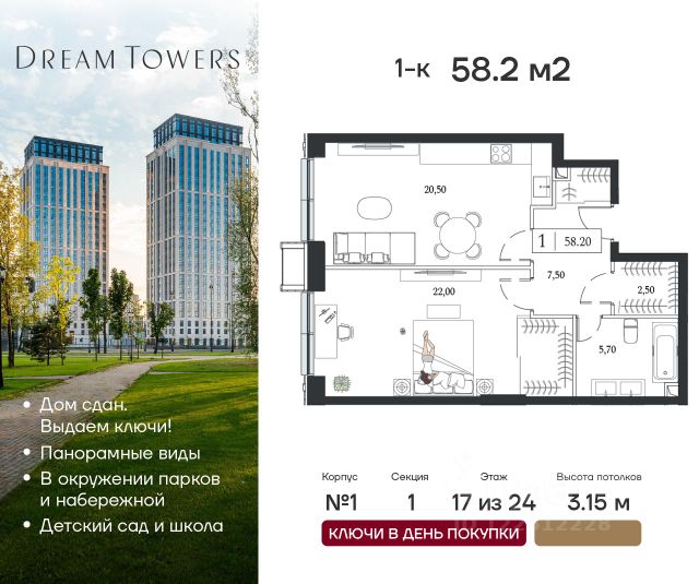• ✓ В базе Циан 7 1-комнатных квартир в ЖК Dream Towers в Москве
