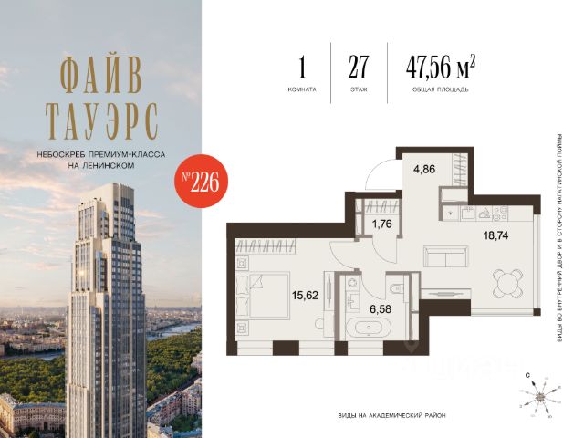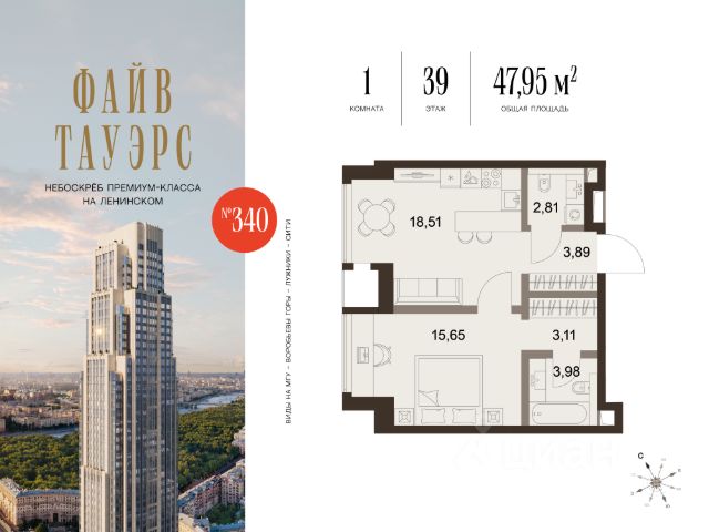 Гибкие программы рассрочки: 0% без переплат и удорожания; первый взнос от 10%. • Уникальная, нетипичная планировка с детально продуманными функциональными зонами • Просторная прихожая с гостевым санузлом, отделяющая входную группу от основной части квартиры • Большая кухня-гостиная с тремя панорамными окнами • Приватная мастер-спальня площадью почти 20 кв. м с двумя панорамными окнами • Просторная ванная комната с окном в мастер-спальне О проекте ФАЙВ ТАУЭРС — первый жилой небоскрёб на Ленинском проспекте и самый высокий дом столицы за пределами делового кластера "Москва-Сити". Премиальный небоскрёб представляет собой ультрасовременное, высокотехнологичное здание, идеальный синтез стилей культовых высоток Москвы и небоскребов Нью-Йорка и поражает воображение уникальными видами, монументальной роскошью и совершенством форм. Величественная панорама, открывающаяся из окон вашей квартиры, завораживает: легендарные сталинские высотки, шпиль главного корпуса МГУ, "Москва-Сити", спорткомплекс "Лужники". Окружение 75-этажный жилой комплекс премиум-класса расположен в историческом Донском районе. Транспортная инфраструктура проекта сделает жизнь резидентов ФАЙВ ТАУЭРС комфортной и продуманной: удобные выезды на ТТК и Садовое кольцо, 10 минут до метро "Ленинский проспект", 11 минут на МЦК до Москва-Сити. Рядом расположены крупные деловые и бизнес-центры, а в шаговой доступности — 500 га парков, образуемых Музеоном, Парком Горького и парком "Воробьевы горы". Инфраструктура Архитектурное бюро Олега Клодта разработало дизайн общественных пространств ФАЙВ ТАУЭРС: гранд-лобби, камерную библиотеку c камином и лифтовую зону. Все необходимые сервисы сосредоточены на первых этажах небоскрёба: кафе, винотека, салон красоты, фитнес и детский клуб. Приватный Sky Club 49 — респектабельный лаундж с открытой террасой и ограниченным доступом на 49 этаже — только для резидентов. Квартиры в ФАЙВ ТАУЭРС Все квартиры в ФАЙВ ТАУЭРС будут сданы с предчистовой отделкой (white box). Это позволит будущим резидентам комплекса сосредоточиться на творческой части ремонта, не связанной с организацией черновых работ. В жилом небоскребе ФАЙВ ТАУЭРС запланировано 596 премиальных квартир и 87 типов планировочных решений, которые можно адаптировать под личные запросы и сценарии проживания. В комплексе премиум-класса представлены не только двух- и трехкомнатные квартиры с угловым остеклением, но и однокомнатные с видом на две стороны и трехкомнатные квартиры с видами на три стороны, что является редким предложением на рынке недвижимости.