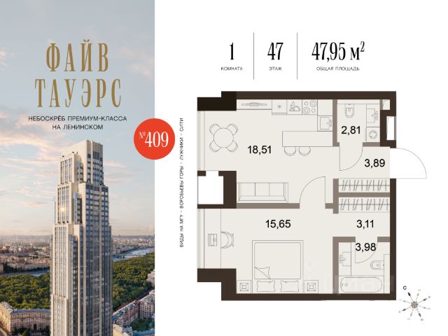 [Забронировано] Гибкие программы рассрочки: 0% без переплат и удорожания; первый взнос от 10%. • Просторная однокомнатная квартира с угловым панорамным остеклением в кухне-гостиной • Функциональная планировка: квартира разделена на приватную и общую зоны • Изолированная вместительная гардеробная комната • Большая ванная комната с окном и нишей под стиральную и сушильную машины (площадь 6,58 кв. м) • Спальня с двумя панорамными окнами О проекте ФАЙВ ТАУЭРС — первый жилой небоскрёб на Ленинском проспекте и самый высокий дом столицы за пределами делового кластера "Москва-Сити". Премиальный небоскрёб представляет собой ультрасовременное, высокотехнологичное здание, идеальный синтез стилей культовых высоток Москвы и небоскребов Нью-Йорка и поражает воображение уникальными видами, монументальной роскошью и совершенством форм. Величественная панорама, открывающаяся из окон вашей квартиры, завораживает: легендарные сталинские высотки, шпиль главного корпуса МГУ, "Москва-Сити", спорткомплекс "Лужники". Окружение 75-этажный жилой комплекс премиум-класса расположен в историческом Донском районе. Транспортная инфраструктура проекта сделает жизнь резидентов ФАЙВ ТАУЭРС комфортной и продуманной: удобные выезды на ТТК и Садовое кольцо, 10 минут до метро "Ленинский проспект", 11 минут на МЦК до Москва-Сити. Рядом расположены крупные деловые и бизнес-центры, а в шаговой доступности — 500 га парков, образуемых Музеоном, Парком Горького и парком "Воробьевы горы". Инфраструктура Архитектурное бюро Олега Клодта разработало дизайн общественных пространств ФАЙВ ТАУЭРС: гранд-лобби, камерную библиотеку c камином и лифтовую зону. Все необходимые сервисы сосредоточены на первых этажах небоскрёба: кафе, винотека, салон красоты, фитнес и детский клуб. Приватный Sky Club 49 — респектабельный лаундж с открытой террасой и ограниченным доступом на 49 этаже — только для резидентов. Квартиры в ФАЙВ ТАУЭРС Все квартиры в ФАЙВ ТАУЭРС будут сданы с предчистовой отделкой (white box). Это позволит будущим резидентам комплекса сосредоточиться на творческой части ремонта, не связанной с организацией черновых работ. В жилом небоскребе ФАЙВ ТАУЭРС запланировано 596 премиальных квартир и 87 типов планировочных решений, которые можно адаптировать под личные запросы и сценарии проживания. В комплексе премиум-класса представлены не только двух- и трехкомнатные квартиры с угловым остеклением, но и однокомнатные с видом на две стороны и трехкомнатные квартиры с видами на три стороны, что является редким предложением на рынке недвижимости.