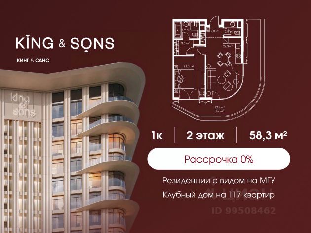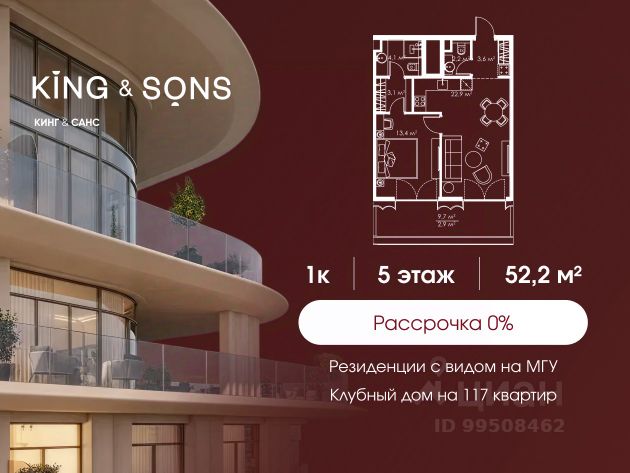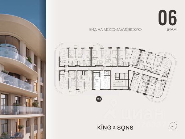 КИНГ энд САНС это клубный дом на 117 резиденций премиум-класса, расположенный на престижной и исторической улице Мосфильмовская. Из большинства квартир открываются панорамные виды на МГУ, "Москву-Сити", особняки посольств и парки. Это место для тех, кто не хочет выбирать между комфортом мегаполиса и уединением на природе. Проект разработан международным архитектурным бюро, которое входит в ТОП-2 в мире. Фасады из натурального камня, мягкие формы здания, максимально открытое остекление, окна в пол — все это делает облик здания выразительным и уникальным. В проекте предусмотрено 70% квартир с террасами. Потолки от 3,2 до 4,7 м. Паркинг на 110 машиномест. Для будущих резидентов продуманы разнообразные общественные пространства зимний сад в лобби первого этажа, секретный сад с зоной открытого огня, лаундж-зона с кинотеатром на крыше, собственный спортзал, зоны для занятий йогой и медитацией. КИНГ энд САНС это фамильная недвижимость, которую с гордостью передают по наследству
