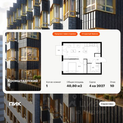 Продаётся 1-комн. квартира площадью 41,1 кв.м на 3 этаже 32 этажного дома (Корпус 1.1.3, Секция 3) проекта ПИК Кронштадтский 9. Светлый просторный подъезд на уровне земли, функциональная планировка, большие окна, предчистовая отделка. Жилой квартал "Кронштадтский 9" возводится в Головинском — в одном из районов с лучшей экологией в Москве. Совсем рядом станция метро "Водный стадион" — до неё 3 минуты пешком. Поездка на машине до Ленинградского шоссе займёт 2 минуты, до ТТК — 10 минут, а до МКАД — 16 минут. Недалеко от жилого квартала находятся парки и пруды — спокойные места для прогулок и отдыха. В "Кронштадтском 9" можно купить квартиру в уже готовом корпусе и сразу получить ключи. В проект входит 10 корпусов с просторными и светлыми подъездами, два детских сада и подземный паркинг. Внутри квартала будут уютные дворы-парки с детскими площадками и местами для отдыха. А чуть дальше, чтобы шум не беспокоил жителей домов, мы построим спортивные площадки. Во всех квартирах в этом проекте предчистовая отделка, с которой легче реализовать ваши дизайнерские идеи. В районе, где строится "Кронштадтский 9", есть всё для комфортной жизни: школы, сады, вузы, магазины и крупные торговые центры "Водный" и "Метрополис". В 15 минутах ходьбы — парк у Головинских прудов, в 18 минутах — парк "Дружба". Оба для прогулок, пробежек и отдыха от дома и работы. Ключевая особенность новых корпусов проекта — это особый архитектурный образ, разработанный бюро М.А.М. Здания привлекают внимание контрастом светлых фасадных поверхностей с тёмными, более детализированными элементами. Архитектурные приёмы формируют связь с городским контекстом: низкоэтажные корпуса естественно вписываются в окружающий ландшафт, в то время как 32-этажная башня добавляет вертикальный акцент, усиливающий общий облик квартала. В "Кронштадтском 9" умные планировки: вы сами выбираете, как их использовать, чтобы ваша квартира была максимально комфортной именно для вас. Например, постирочная может стать студией звукозаписи, а зона для гардероба — кабинетом. В новых корпусах есть квартиры с кухней-нишей, сквозным санузлом и мастер-спальней с собственной ванной. Квартиры продаются с предчистовой отделкой. Это значит, что к моменту получения ключей в доме уже закончатся самые грязные и шумные работы, а вам будет легче реализовать дизайнерские идеи. Рядом с проектом есть всё необходимое. В паре минут пешком — торговые центры "Гавань" и "Водный", а в 7 минутах на машине — большой ТРЦ "Флотилия". В шаговой доступности аптеки и детская городская поликлиника. Доехать до взрослой поликлиники можно за несколько минут. Вокруг несколько интересных мест для прогулок, в том числе с детьми. Можно арендовать лодку или просто понаблюдать за плывущими яхтами и парусниками на Северном речном вокзале, побродить по парку возле усадьбы Грачёвки или сходить в музей охоты и рыболовства. Артикул 967557 (Застройщик АО "Специализированный застройщик МАК8")