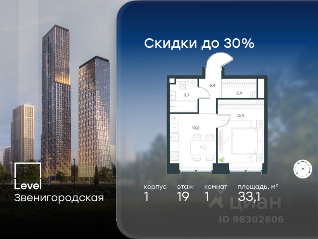 Цена указана с учётом скидки при 100%-й оплате, несубсидированной ипотеке, рассрочке (кроме программы "Рассрочка 0%"). В жилом квартале продаётся 1-комнатная квартира площадью 35.90 кв.м без отделки. Квартира расположена на 20 этаже 64 этажного корпуса 2 в жилом комплексе комфорт класса Level Звенигородская (компания Level Group/Левел групп). Отличная транспортная доступность - 5 мин. пешком до метро "Звенигородская" (откроется к окончанию строительства); - 18 мин. пешком до станции МЦК "Хорошёво" и станции БКЛ "Народное ополчение"; - 4 мин. на авто до ТТК; - 8 мин. на авто до Садового кольца; - 15 мин. на авто до Кремля. Продуманный архитектурный проект - Концепция от студии Станислава Михаловского, в основу которой легло единение природы и города; - Двухкамерные стеклопакеты в окнах, алюминиевый и ПВХ профиль - в квартирах тепло зимой и прохладно летом; - С верхних этажей откроются панорамные виды на город, Москву-реку, "Москва-Сити" и Москворецкий парк; - Лобби со всеми удобствами: окна в пол, высокие потолки до 4,7 м, лаунж-зоны, колясочные, гостевые санузлы и мойки для лап животных; - Централизованные водонагреватели гарантируют круглогодичную подачу горячей воды в каждую квартиру. Благоустройство Концепция благоустройства разработана совместно с бюро UNK landscape. Высота башен приближается к 200 метрам - они словно касаются неба. Небесный простор проецируется на территорию двора с помощью подсветки, визуально увеличивая пространство и отражаясь в авторских элементах архитектуры. На территории площадью 0,45 га расположатся: - "Облако событий" - место встреч и общения; - "Облако спорта" - всё для поддержания себя в форме; - "Облако принятия решений" - пространство для работы на свежем воздухе; - "Облако спокойствия" - для отдыха в тишине природы; - "Облако игр" - площадки для подростков и самых маленьких. Инфраструктура В жилом комплексе откроется 21 коммерческое помещение: продуктовые лавки, кафе, салоны красоты, службы доставки и творческие студии. Этап 1 включает строительство двухуровневого подземного паркинга. Всего здесь расположится 351 машино-место, включая семейные места, и 264 кладовых помещения. В распоряжении жителей развитая инфраструктура района: 15 супермаркетов, 5 спортивных объектов, 9 медучреждений, 7 детских садов, 4 школы, 3 благоустроенных парка - всё в шаговой доступности. Инженерия Комфортное перемещение внутри домов будут обеспечивать надёжные лифты с доступом в паркинг с жилых этажей. В каждом корпусе предусмотрено до шести кабин, включая сервисные лифты. Попасть на территорию комплекса можно только по единому ключу доступа. Видеонаблюдение установлено на входах в подъезды, в лобби, в общих зонах, на въезде в паркинг. Гости смогут связаться с жителями дома через входные видеопанели, а управлять доступом на территорию можно через видеодомофон или приложение на телефоне.