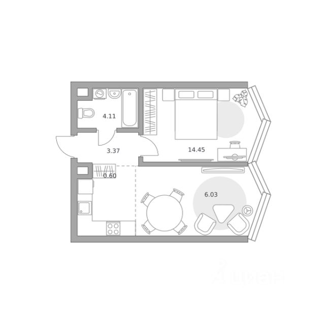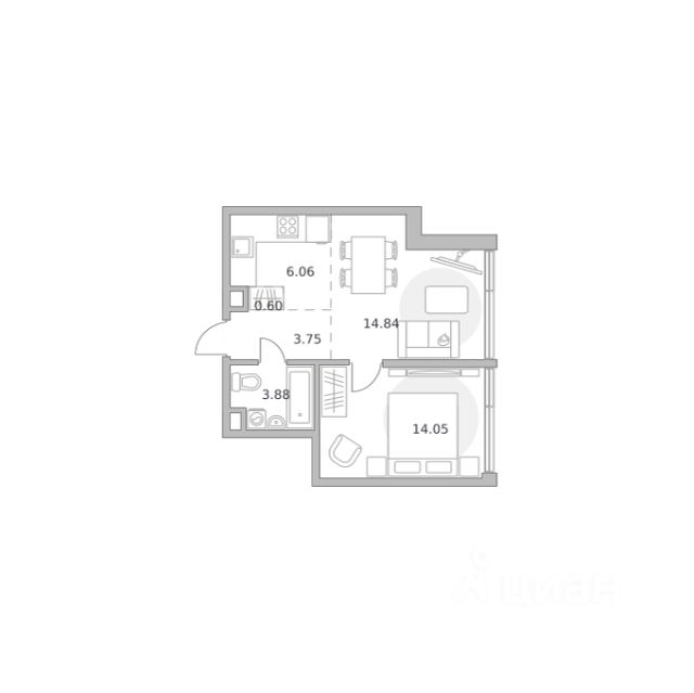 Продаётся 1-комнатная квартира 1403, площадью 44,04 м², на 15 этаже в ЖК "Мнёвники от Гранель" корпус 1. Стоимость — от 24912866 руб. Квартира без отделки, планировка односторонняя, окна во двор.
