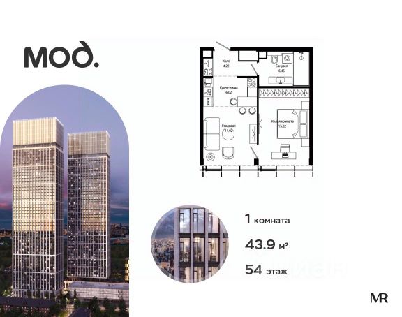 Прямая продажа от застройщика. Продается 1-комнатная квартира общей площадью 43.50 м² с предчистовой отделкой в ЖК премиум-класса Мод на 10-м этаже 55 этажного дома. Мод - жилой комплекс премиум-класса в историческом районе Москвы Марьина Роща, состоящий из трех Клубных домов (9 этажей) и трёх разноэтажных башен (44-55 этажей). Закрытая территория жилого комплекса, продуманное благоустройство, эксплуатируемые кровли стилобата, образовательный центр с детским садом создают приватное пространство для тихой семейной жизни, а городская площадь с фонтанами, ресторан, супермаркет, коммерческая инфраструктура на первых этажах привносят созвучную с ритмом города динамику. Преимущества проекта: - В шаговой доступности новый деловой кластер Москвы - Выразительная авторская архитектура - Единственные в Москве фасады башен из натурального камня - Панорамное остекление и высота потолков до 4,8 м - Квартиры и апартаменты с отделкой MR Base - Многоуровневое благоустройство с зонированием на закрытой территории - Многофункциональный образовательный детский центр с детским садом - Двухуровневый подземный паркинг Транспортная доступность: - 5 минут пешком до станции метро "Марьина Роща" - 3 минуты до ТТК - 15 минут до Цветного бульвара Компания MR предлагает своим клиентам специальные условия приобретения квартир в рамках программ ипотечного кредитования от банков-партнеров.