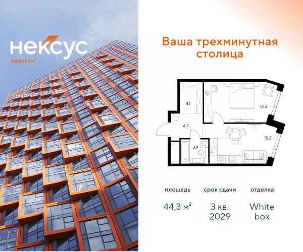 Продажа от застройщика. О проекте: В основе Несус Аквилон лежит принцип трехминутного города, где вся жизнь: работа, отдых, здоровье, общение и культура сосредоточены в шаговой доступности. Он не просто экономит время, а кардинально перераспределяет его. В этих условиях главным логистическим узлом становится лифт, который в считанные секунды переносит из квартиры в собственный фитнес-рум, панорамный двор или современный коворкинг. Здесь вы сами решаете: оказаться в эпицентре событий, чувствуя пульс мегаполиса, или наслаждаться тишиной и приватностью своего пространства. И главное — вы можете переключаться, находя идеальный баланс каждый день. Несус Аквилон - ваша трехминутная столица! Транспортная доступность Несус Аквилон дарит независимость от расстояний и логистики. Ваше время теперь принадлежит только вам меньше минуты до метро Молодежная 2 минуты до Рублевского шоссе 10 минут до Проспекта Багратиона 15 минут до Москва-Сити 10 минут до МКАД 20 минут до ТТК Архитектура 46-этажная башня станет новой архитектурной доминантой, символизирующей динамику и технологичность современной жизни.Комбинация алюминиевых кассет, стеклофибробетона и витражного остекления фасада создает монументальную оболочку, а теплая цветовая гамма добавляет масштабной форме визуальной теплоты. Три разных по характеру стороны башни — от строгой "зубчатой" геометрии до живописных эркеров — создают многогранный, ритмичный образ, дополняемый невесомыми балконами со стеклянным ограждением. Архитектура проекта живет в диалоге с городом: променад вдоль парящего стилобата со стрит-ретейлом становится естественным продолжением общественного пространства. Планировки в концепции Разумные метры Мы создали квартиры, где пространство работает на ваш комфорт. В основе концепции "Разумные метры" правильная геометрия помещений и тщательно продуманные эргономичные решения. - Высота потолков до 3,55 метров - Многообразие планировок: от студий до четырехкомнатных квартир классического и евро-формата - Многофункциональные пространства: кухни-гостиные для приема гостей и зонированные мастер-спальни - Продуманная инфраструктура быта: отдельные постирочные и гостевые санузлы - Удобные системы хранения: встроенные ниши и гардеробные зоны - Уникальные форматы: пентхаусы, комнаты с двумя окнами, угловое панорамное остекление - Возможность открытия окон на всех высотах Для студий и однокомнатных квартир мы предлагаем готовое решение — отделку White box, позволяющую сразу приступить к чистовому ремонту на ваш вкус. Для остальных планировок предусмотрена черновая отделка, чтобы воплотить все интерьерные пожелания. Здесь пространство адаптируется под ваш образ жизни, а не вы подстраиваетесь под планировку. Приватное благоустройство Скрытый на виду панорамный двор-терраса, расположенный на высоте 7 метров, объединил внутреннюю камерность и внешнюю динамику городской жизни. - Многоуровневое озеленение с всесезонными композициями, сохраняющими декоратив