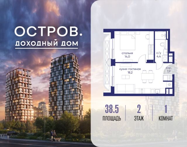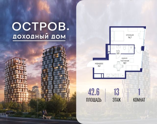 Продаётся однокомнатная квартира от застройщика: общая площадь 42.60 м², жилая 14.70 м², кухня 19.20 м², 17, жилой квартал "Остров 12", корпус 3 (12.1 квартал) (секция 1). срок сдачи: 4-кв. 2025. , 1 совмещенный санузел. В жилой зоне 2 больших окна на одну сторону, хорошая инсоляция. Позвоните сейчас и забронируйте квартиру! Купите квартиру для курортной жизни в Москве в квартале ОСТРОВ.12.1. Это единственный на ОСТРОВЕ квартал бизнес-класса, расположенный на первой линии у реки - здесь царит атмосфера ежедневного отпуска. Дома созданы в узнаваемом футуристичном стиле и выглядят как произведения современного искусства. Для жителей предусмотрены фитнес-рум и детский клуб, гостиная и кинотеатр, переговорные и репетиторские комнаты. На крышах устроены видовые общественные пространства с зонами для йоги, коворкингами, лаунжами. Двор-парк располагает всем необходимым для отдыха и общения всех возрастов. ОСТРОВ.12.1 - часть жилого комплекса на западе Москвы, в 15 минутах езды от центра. Это настоящий заповедник посреди большого города, в окружении реки и 650 га заповедников. Здесь все необходимое находится по соседству: от детского сада до супермаркета, от фитнес-зала до серфинг-центра. На территории созданы все условия для отдыха и общения: клубная инфраструктура в домах и дворы-парки, набережные и променады, маршруты для спортсменов, детей и возрастных жителей. В нескольких минутах ходьбы расположена станция метро "Мнёвники" БКЛ. На автомобиле - 10 минут до Москва-Сити и 15 минут до Садового кольца.