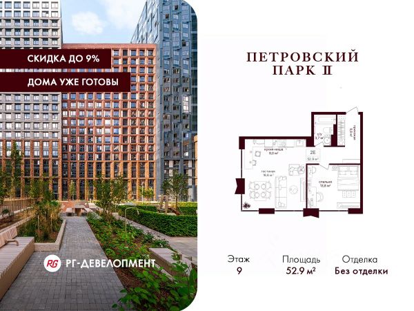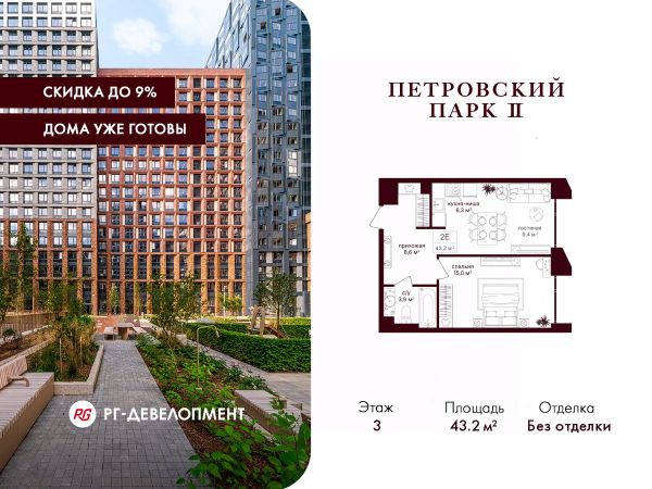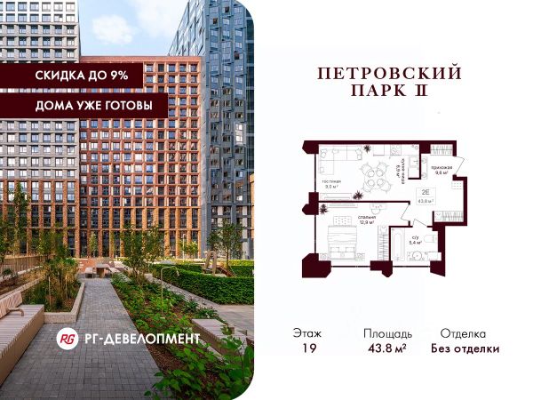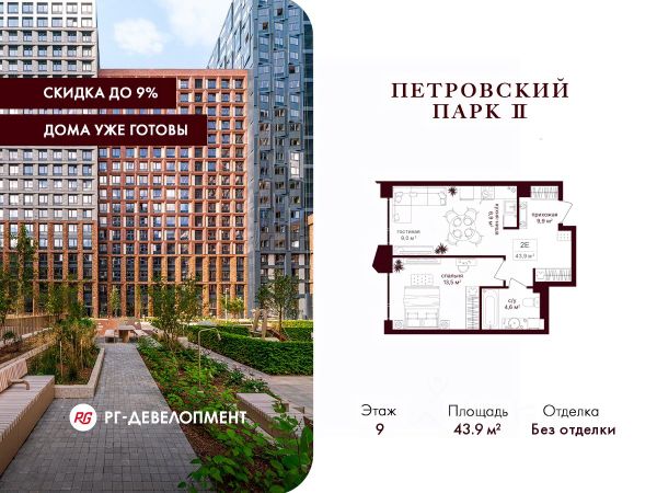 Продаётся 1-комнатная квартира 43,9 кв.м. в ЖК "Петровский парк II" на 2-м этаже 24 этажного дома. Скидка 9% при покупке квартиры! Цена указана с учетом максимального размера скидки. Компания "РГ-Девелопмент" предоставляет скидки на квартиры в жилом комплексе. Акция действительна с 01.11.2025г. до 30.11.2025г. включительно. Для того чтобы воспользоваться предложением, необходимо подписать договор на приобретение недвижимости до 30.11.2025г., включительно. ЖК "Петровский парк II" расположен в историческом районе Москвы, в 5 минутах от парка и станции метро "Динамо". Архитектуру от Syntaxis характеризуют асимметричные фасады, геометрические выступы, напоминающие волны. Эстетика архитектурных форм продолжается в интерьере внутренних пространств - двух центральных лобби и входных группах. На закрытой территории зеленые зоны с цветниками, места для отдыха, спортивные и игровые площадки. Подземная парковка, близость основных магистралей и удобные выезды, которые дают возможность жителям комплекса быть в центре культурной и общественной жизни. Комфортной жизни на территории комплекса расположены магазины, рестораны, частный детский сад.