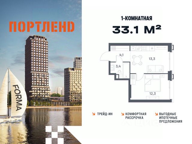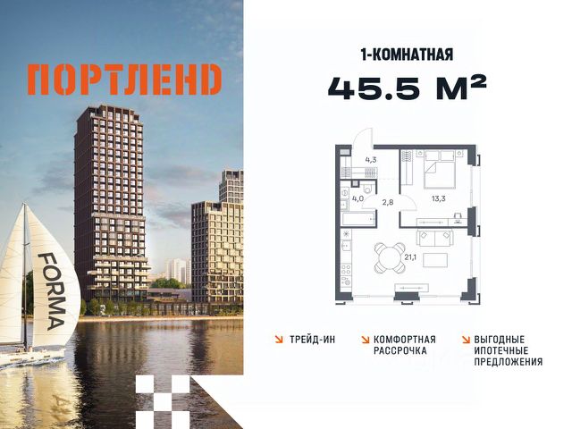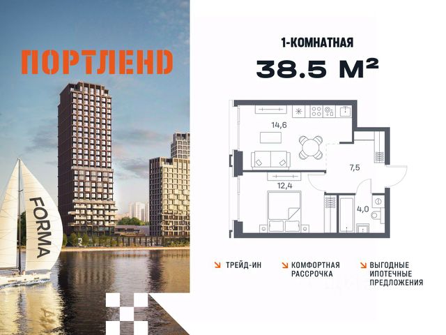 Цены указаны с условием 100% оплаты и стандартной ипотеки. Продаётся 1-к. квартира, 14 этаж в жилом комплексе бизнес-класса ПОРТЛЕНД от девелопера FORMA. ЖК расположен на берегу Москвы-реки в северной части района Печатники в акватории Южного речного порта. Основные преимущества проекта: • Самая протяженная береговая линия реки в Москве 13 км. • Вид на реку в сторону запада панорамные окна на самое широкое водное пространство Москва-реки (900 м) и на закат. • 95% квартир с видом на воду. • К ПОРТЛЕНД не примыкает крупных автомагистралей - отсутствие фонового шума дорог. • В перспективе ближайших 11 лет на территории района запланировано грандиозное преобразование и комплексное развитие. • Собственная набережная длиной 412 м., которая после завершения строительства сомкнется с эко-парком Печатники. • Прямой выход к воде и отсутствие проезжей части между ПОРТЛЕНД и береговой линией. • Инфраструктурное разнообразие: супермаркеты, крупные торговые центры, рестораны, кафе, фитнес-клубы, бьюти-салоны, компании сферы услуг и многое другое. • Собственная школа на 300 мест и детский сад на 275 мест. • Паркинг на 650 м/м • Транспортная вседоступность: метро, авто, велосипед, речной трамвай, канатная дорога • 15 мин. пешком до м. Печатники, 15 мин. на авто до ТТК, 20 минут на авто до Садового кольца