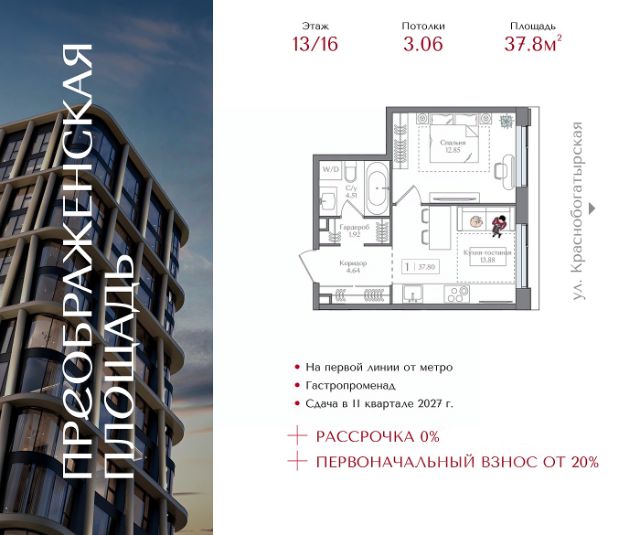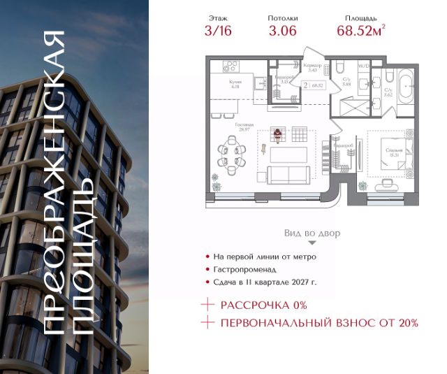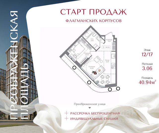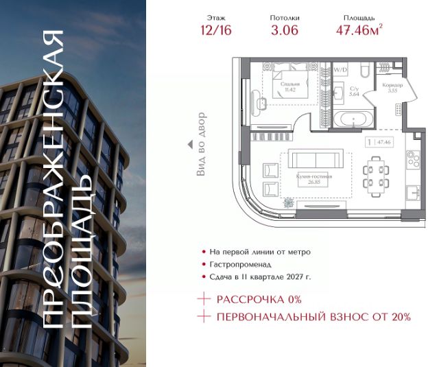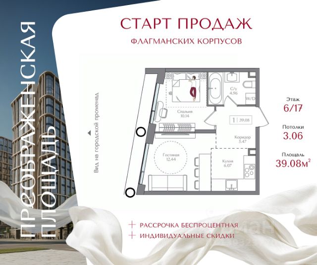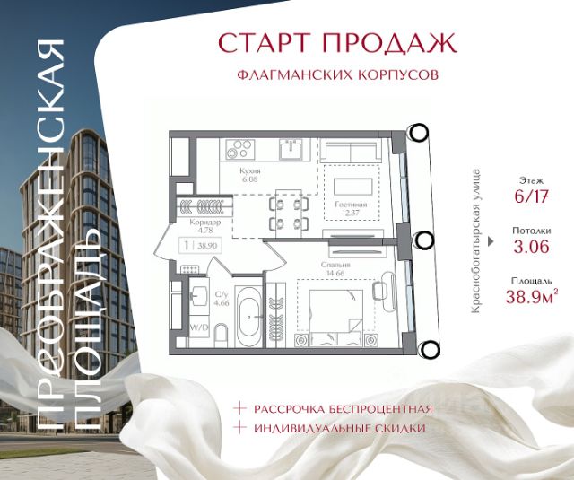 Рассрочка 0% с первоначальным взносом от 20% Квартира на 5 этаже в жилом комплексе премиум-класса "Преображенская площадь". Общая площадь: 40.9 кв.м. Проект премиум-класса в историческом районе Москвы. До метро "Преображенская площадь" 3 минуты пешком. Квартиры сдаются без отделки и в свободной планировке, чтобы жители могли оформить пространство с учетом своей индивидуальности. Высота потолков от 3,15м, широкоформатное остекление, 3-5 квартир на этаже. Система Умный дом. Дизайнерские лобби. Внутренний двор 1,5 га функциональное и безопасное пространство для игр, работы и занятий спортом. Пешеходный променад для прогулок. Дома переменной этажности. Есть подземный паркинг. Жилой комлекс находится в окружении парков Сокольники, Черкизовский, Измайловский, заповедника Лосиный остров и ВДНХ, а также вблизи пешеходной набережной. Комфортная удаленность от центра: 7 минут на автомобиле до ТТК, 8 минут до Садового кольца, 25 минут до Кремля.