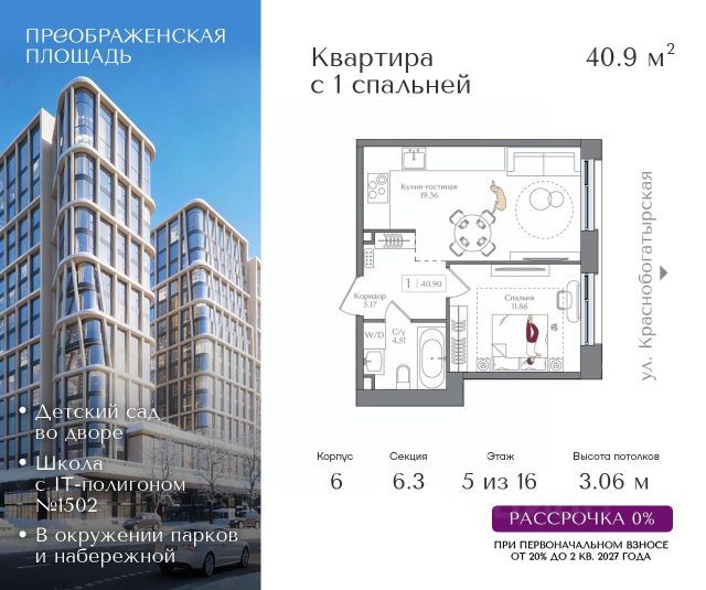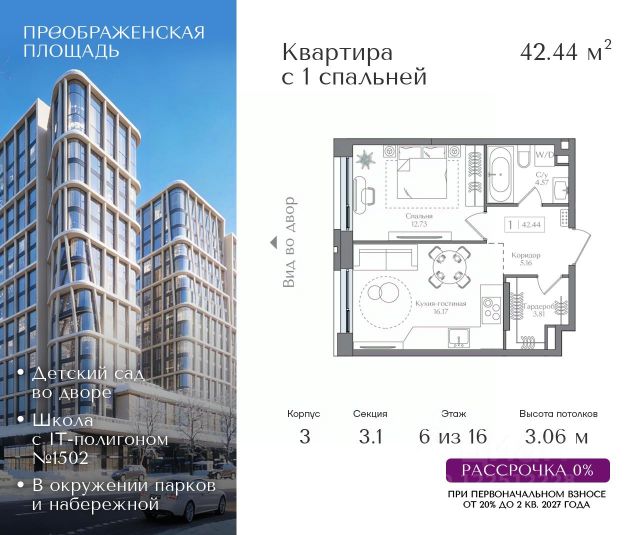 Квартира на 3 этаже в жилом комплексе премиум-класса "Преображенская площадь". Общая площадь: 45.12 кв.м. Проект премиум-класса в историческом районе Москвы. До метро "Преображенская площадь" 3 минуты пешком. Квартиры сдаются без отделки и в свободной планировке, чтобы жители могли оформить пространство с учетом своей индивидуальности. Высота потолков от 3,15м, широкоформатное остекление, 3-5 квартир на этаже. Система Умный дом. Дизайнерские лобби. Внутренний двор 1,5 га функциональное и безопасное пространство для игр, работы и занятий спортом. Пешеходный променад для прогулок. Дома переменной этажности. Есть подземный паркинг. Жилой комлекс находится в окружении парков Сокольники, Черкизовский, Измайловский, заповедника Лосиный остров и ВДНХ, а также вблизи пешеходной набережной. Комфортная удаленность от центра: 7 минут на автомобиле до ТТК, 8 минут до Садового кольца, 25 минут до Кремля.
