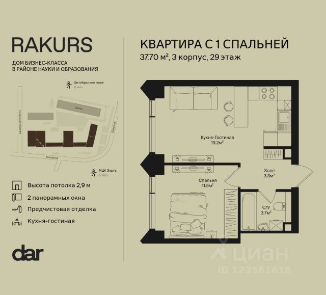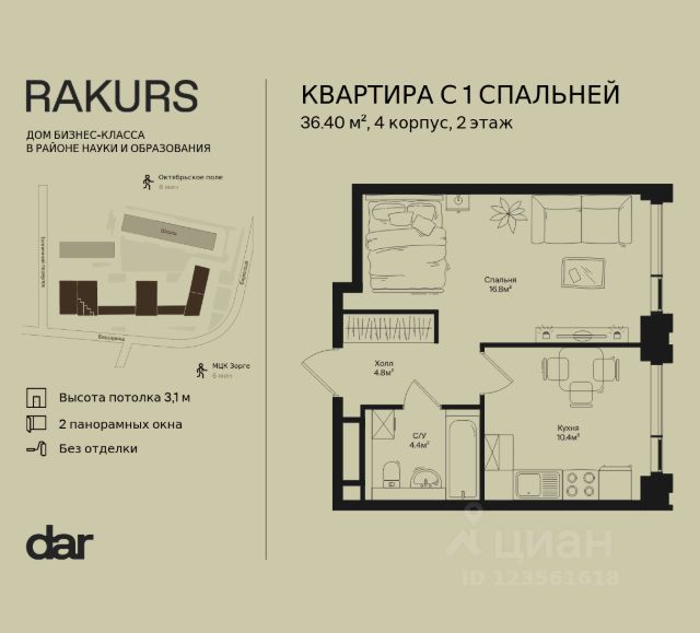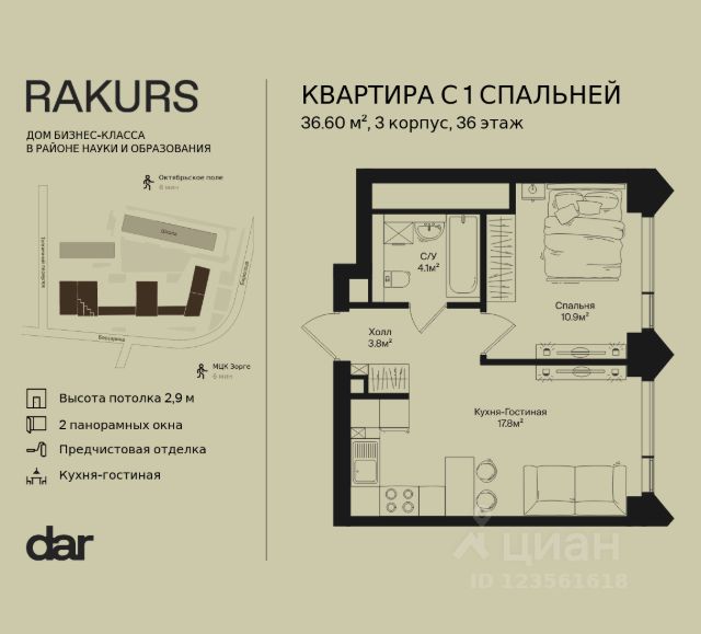 Продаётся 1-комнатная квартира 36.30 м² в жилом комплексе Ракурс. Квартиру отличают панорамное остекление, потолки 2,9 м, улучшенная шумо и воздухоизоляция. Дом сдаётся в 1 квартале 2028 года, продажи проходят через эскроусчета. Подземный паркинг, коворкинг, закрытая благоустроенная территория с фонтаном и артобъектами. Гибкие условия покупки. Rakurs — место, в котором жизнь приглашает к исследованию. Концепция проекта knowledge-centric среда, которая выражается здесь в образе жизни: • атмосфере интеллектуальной среды, • доступности образования, • фокусе на возможности для развития. RAKURS разместился в районе науки и окружен исследовательскими институтами и образовательными учреждениями, при этом на территории построена своя школа с уникальной концепцией. Расположенный на пересечении улиц Маршала Бирюзова и Берзарина, недалеко от станций метро "Октябрьское поле" и "Зорге", дом угождает транспортной доступностью автомобилистам и пешеходам. Инфраструктура же района создана с заботой о людях: здесь много парков, кафе и других уютных мест для отдыха. В состав комплекса входят три башни высотой 18, 26 и 44 этажа, каждая из которых имеет свой запоминающийся силуэт. Между собой башни связаны среднеэтажными строениями с индивидуальными фасадами. Композиция и пластика корпусов, а также панорамное остекление башен обеспечивают квартиры максимальным количеством дневного света и выигрышными видами на центр города и Москву-Сити. Упор на функциональность не лишает проект его уникального образа — все башни имеют неординарную форму с харизматичными уступами и консолями. Rakurs предлагает широкий выбор уникальных вариантов жилья — от студий до эксклюзивных квартир с приватными террасами. Проект спроектирован с фокусом на биофильность и функциональность. Во дворах Rakurs можно насладиться завтраком на террасе кафе, игрой с детьми или спортом на свежем воздухе. В Rakurse cвой комьюнити-центр - многофункциональное пространство для работы, отдыха, общения и развития. Одна из важнейших частей центра — частная библиотека с лаундж-зоной. Книжный фонд отбирается для нее кураторской командой, а дизайн пространства сделан так, чтобы жители могли почувствовать умиротворяющую атмосферу библиотечного зала. Идея knowledge-centric среды поддерживается здесь и книжным магазином с лекторием, а также зонами для самостоятельной учебы и занятий с преподавателями.