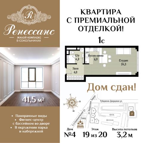 Жилой комплекс премиум-класса "Ренессанс" расположен на Рубцовско-Дворцовой улице исторического района Сокольники, в неск. мин. ходьбы от знаменитого парка "Сокольники", где круглый год можно прекрасно проводить время всей семьей. Квартиры продаются с полной отделкой, что обеспечивает комфорт проживания в доме сразу после получения ключей, т.к. исключает длительный период ремонта квартир - у вас и соседей, а также сохраняет презентабельные входные группы в идеальном состоянии. Премиальная отделка квартир "под ключ" выполнена европейскими специалистами по эксклюзивным дизайн-проектам с использованием дорогих материалов: экологичное напольное покрытие - инженерная доска TRIO на хвое (материал - дуб) и керамогранит KERAMA MARAZZI с обогревом пола, стяжка пола с шумоизоляцией, современные системы кондиционирования и сантехническое оборудование премиум-класса - Villeroy Boch, Grohe, Geberit Duofix, выключатели и розетки - Berker. Высокие потолки - 3,2 м и входные двери квартир - 2,4 м со вставками из массива дуба, выполненные в едином стиле, подчеркивают премиальный статус владельцев. Из панорамных окон премиального бренда Schuco открываются завораживающие виды на сияющие в лучах солнца купола церквей и храмов, зелень легендарного парка "Сокольники" и национального парка "Лосиный остров", излучины реки Яузы с величественной гранитной набережной, старинные здания, среди которых дворец императрицы Елизаветы Петровны, небоскребы "Москва-Сити", Останкинскую телебашню и приватную, охраняемую территорию комплекса с концепцией "двор без машин", изысканным ландшафтным дизайном, богатой коллекцией растений, пространствами для отдыха с роскошным фонтаном с красивой подсветкой, элегантной перголой, большими шахматами, детскими городками и спортивными площадками. Роскошный интерьер лобби: натуральный испанский мрамор, вертикальный фонтан, репродукции картин эпохи Возрождения, великолепная итальянская люстра ручной работы с подвесками из хрусталя CutCrystal и муранского стекла, иранские ковры, дизайнерская мебель. Лифты премиум-класса ThyssenKrupp. Консьерж-сервис. На этажах мусорокамеры закрытого типа. Из квартиры можно связаться с консьержем по видеодомофону британской компании BAS-IP. Уникальная транспортная доступность: 5 мин. на авто до ТТК и Русаковской эстакады, 10 мин. - до Садового кольца и ул. Земляной Вал, 15 мин. - до Кремлевской наб. В шаговой доступности - ст. м. и БКЛ "Сокольники" и "Электрозаводская". Развитая собственная инфраструктура: подземный паркинг, здание фитнес-центра с бассейнами, объекты торговли и сферы услуг. Отличная инфраструктура респектабельного района Сокольники: детсады, элитные общеобразовательные, музыкальные и спортивные школы, ТЦ и т.д.