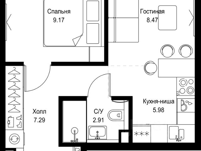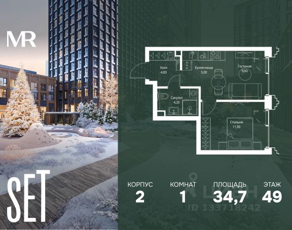 Прямая продажа от застройщика. В ЖК SET продается 1-комнатная квартира площадью 31.05 м², расположенная в корпусе Б, на 56 этаже 59 этажного дома. SET имеет стратегически выгодное расположение в ЗАО, в районе с большой историей и блестящим будущим: между природной зоной долины реки Сетунь и Кутузовским проспектом. В рамках возведения первой очереди предусмотрено три корпуса высотой 18, 45 и 59 этажей. На верхних этажах спроектированы общедоступные смотровые площадки с панорамным обзором на центр столицы. Преимущества проекта: • Функциональные планировочные решения • Контроль проникновения через входную дверь • Система управления освещением и температурой в квартире • Система защиты от протечек с функцией перекрытия воды • Вход в подъезд по биометрическим считывателям Face ID • Скоростные лифты • Двухуровневый подземный охраняемый паркинг на 495 машино-мест Застройка SET включает в себя не только жилые корпуса, но и инфраструктурные объекты. Все необходимое для повседневного комфорта будет расположено в шаговой доступности: • Фитнес-клуб с бассейном • Ведущая городская школа, детский сад и школа искусств • Центр культуры и досуга • Медицинский центр • Кафе и рестораны Расположение комплекса: Пешком: • Метро "Давыдково" - 17 минут • Парк "Долина реки Сетунь" - 3 минуты • Открытие новых станций метро в шаговой доступности в будущем Инфраструктура: Разнообразить свой день резиденты VEER смогут также проводя больше времени на свежем воздухе. Двор разделен на 4 зоны разных эмоций и действий, которые пересечены и соединены веерными прогулочными маршрутами: • Спортивная площадка устроена в глубине ""Кленовой рощи"" • В ""Чайном домике"" будет создан навес с утеплением для отдыха в любую погоду • Площадки для детей воплотятся в ""Волшебный лес"" с цветами, зеркалами и световым дизайном • ""Центральная площадь"" устроена у водного оазиса живописного пруда. На машине: • "Москва-Сити" - 15 минут • Садовое кольцо - 20 минут • ТЦ "Океания" - 8 минут • ТЦ "Времена года" - 13 минут • Сколково - 12 минут • Гребной канал - 17 минут Компания MR предлагает своим клиентам специальные условия приобретения квартир в рамках программ ипотечного кредитования от банков-партнеров.