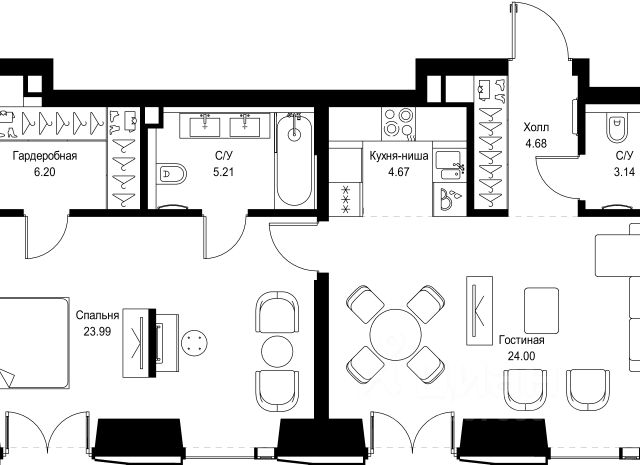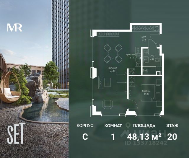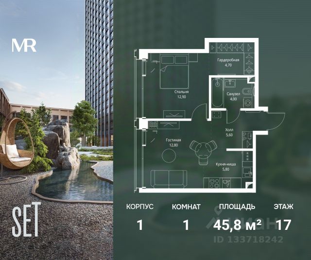 Прямая продажа от застройщика. В ЖК SET продается 1-комнатная квартира площадью 31.20 м², расположенная в корпусе 3, на 2 этаже 45 этажного дома. SET имеет стратегически выгодное расположение в ЗАО, в районе с большой историей и блестящим будущим: между природной зоной долины реки Сетунь и Кутузовским проспектом. В рамках возведения первой очереди предусмотрено три корпуса высотой 18, 45 и 59 этажей. На верхних этажах спроектированы общедоступные смотровые площадки с панорамным обзором на центр столицы. Преимущества проекта: • Функциональные планировочные решения • Контроль проникновения через входную дверь • Система управления освещением и температурой в квартире • Система защиты от протечек с функцией перекрытия воды • Вход в подъезд по биометрическим считывателям Face ID • Скоростные лифты • Двухуровневый подземный охраняемый паркинг на 495 машино-мест Застройка SET включает в себя не только жилые корпуса, но и инфраструктурные объекты. Все необходимое для повседневного комфорта будет расположено в шаговой доступности: • Фитнес-клуб с бассейном • Ведущая городская школа, детский сад и школа искусств • Центр культуры и досуга • Медицинский центр • Кафе и рестораны Расположение комплекса: Пешком: • Метро "Давыдково" - 17 минут • Парк "Долина реки Сетунь" - 3 минуты • Открытие новых станций метро в шаговой доступности в будущем Инфраструктура: Разнообразить свой день резиденты VEER смогут также проводя больше времени на свежем воздухе. Двор разделен на 4 зоны разных эмоций и действий, которые пересечены и соединены веерными прогулочными маршрутами: • Спортивная площадка устроена в глубине ""Кленовой рощи"" • В ""Чайном домике"" будет создан навес с утеплением для отдыха в любую погоду • Площадки для детей воплотятся в ""Волшебный лес"" с цветами, зеркалами и световым дизайном • ""Центральная площадь"" устроена у водного оазиса живописного пруда. " На машине: • "Москва-Сити" - 15 минут • Садовое кольцо - 20 минут • ТЦ "Океания" - 8 минут • ТЦ "Времена года" - 13 минут • Сколково - 12 минут • Гребной канал - 17 минут Компания MR предлагает своим клиентам специальные условия приобретения квартир в рамках программ ипотечного кредитования от банков-партнеров.