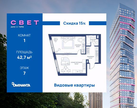Продаётся 1-к квартира 47 кв.м. на 3-м этаже 51 этажного дома. Без отделки. Срок сдачи: 1 кв. 2028 г. Жилой комплекс "СВЕТ" — воплощение современного комфорта и архитектурного изящества, созданное девелопером Dominanta в сотрудничестве с известным бюро СПИЧ. Комплекс представляет собой элегантное 52-этажное здание, расположенное в Западном Дегунино, на Дмитровском шоссе, 83А. Удачное местоположение обеспечивает удобство для жителей: станция метро "Селигерская" находится в пешей доступности, что делает путь в центр Москвы быстрым и комфортным. Транспортная доступность: - 5 минут пешком до станции метро "Селигерская" - 15 минут на машине до ТТК - 16 минут на транспорте до станции МЦД "Моссельмаш" Квартиры бизнес-класса в ЖК "СВЕТ" сочетают функциональность и эстетическое совершенство. Панорамные окна наполняют жилые пространства естественным светом и открывают захватывающие виды на мегаполис. Каждый житель дома получит доступ к бесплатной клубной инфраструктер SocialHUB. Для бизнес-задач и запуска личных проектов хоум-офис c рабочими станциями, переговорными и креативной студией. Для отдыха и формирования новых социальных связей ивент-пространство, которое подойдет для вечеринки, кинопоказа или паблик-тока. Для новых побед зоны для занятия киберспортом. И главное SocialHUB полностью бесплатен для жителей, все расходы на его содержание покрываются застройщиком. Территория проекта "СВЕТ" включает несколько сценарных зон: ландшафтный парк с шаговой тропой, спортивная зона, открытый амфитеатр, двухуровневая детская площадка, уличные рабочие станции и беседки для отдыха. Сложный рельеф с искусственными холмами и живыми изгородям позволяет эффективно разделить пространство на активные зоны и уединённые "кабинеты" для работы, отдыха или медитации. В ЖК "СВЕТ" каждый найдет арену для своей энергии. Для любителей динамичных игр — павильон для падел (модного микса тенниса и сквоша). Рядом — площадка для стритбола и столы для пинг-понга, где можно устроить соседский турнир! И, конечно, абсолютный мастхэв — зона воркаут для функциональных тренировок под открытым небом. У входа в жилой комплекс гостей встречается арт-объект, разработанный Студией Артемия Лебедева. Его мягкий, волнообразный силуэт напоминает разлитый свет. С заходом солнца арт-объект оживает благодаря светоотражающим материалам его форма становится динамичной и задает настроение всему пространству.