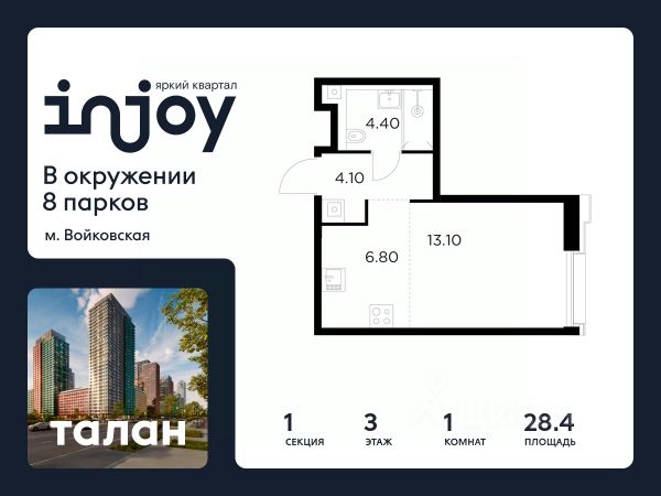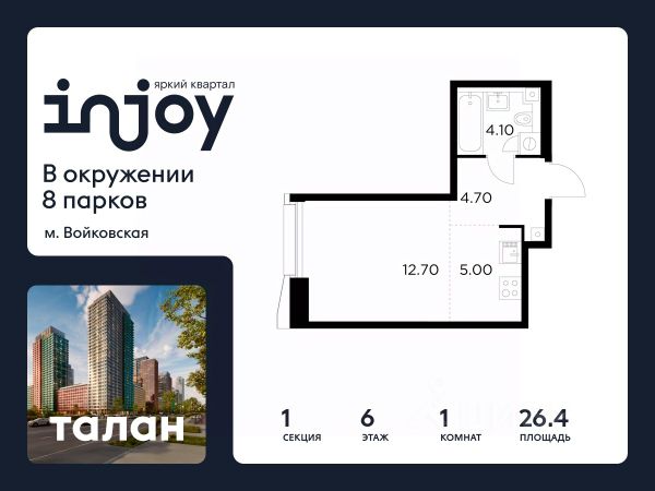 Прямая продажа от застройщика. В жилом квартале, расположенном в Войковском районе Москвы, продаётся 1-комнатная квартира площадью 25 кв.м без отделки. Квартира расположена на 2 этаже 35-этажного дома, корпус 1, в жилом квартале бизнес-класса INJOY. INJOY отделен от Ленинградского шоссе исторической застройкой и расположен всего в одном километре от магистрали: это возможность быстро добраться до центра или в любой район города по МКАДу или ТТК. Для автомобилей в INJOY — удобный подземный паркинг с доступом на лифте. Здесь же расположены кладовые площадью от 2,1 до 9 кв. м. Усилители сотового сигнала в лифтах и паркинге позволяют вести важные разговоры, не прерываясь на полуслове. Десятки мест отдыха вокруг INJOY дарят детям и взрослым запоминающиеся развлечения в любую погоду: от прогулок по паркам и природным зонам до интересного досуга в кругу семьи или друзей. 10 минут до парка Покровское-Стрешнево 12 минут до усадьбы Михалково 15 минут до Химкинского водохранилища 7 минут до ТРЦ "Метрополис" INJOY расположен в развитом сформировавшемся районе, что обеспечивает жителям обширную инфраструктуру в пешей доступности. МЦК "Балтийская" - 200 м Ленинградское шоссе - 1 км м. Войковская - 1 км ТТК - 7 км В проекте INJOY три очереди, разновидность которых формирует силуэт живого мегаполиса. Архитекторы международного бюро AI Studio придали индивидуальность каждому корпусу, чтобы все уголки INJOY обрели особенный характер. Планировки и форматы квартир уникальны: пентхаусы, квартиры с террасами, мастер-спальнями, выходом на променад, угловым остеклением, лоджиями, гардеробными, кладовыми и постирочными. Внутренний двор INJOY продолжает общую концепцию благоустройства и включает в себя: три детские площадки для разных возрастов, зону work-out, природную озеленённую зону, променад с зонами для релакса, йоги и амфитеатром с арт-объектами. Закрытый двор, видеонаблюдение и контроль доступа обеспечивают безопасность каждому жителю комплекса. Стоимость квартиры - 16420400 Р. Срок сдачи - 1 квартал 2027. Более подробную информацию по объекту уточняйте по телефону и в отделе продаж.