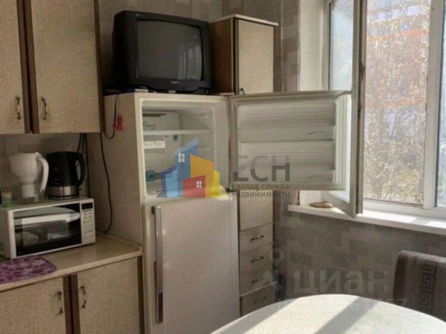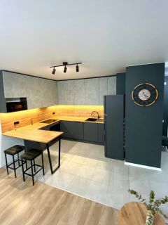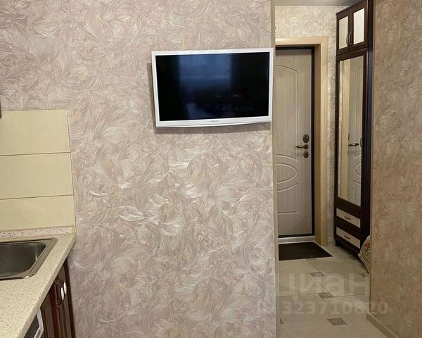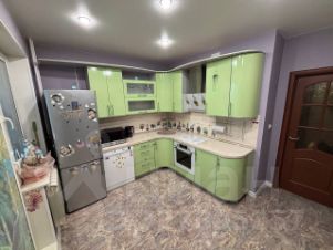 Большая 10-ти метровая кухня с полным комплектом бытовой техники (встроенные: большой холодильник, варочная панель, духовой шкаф, СВЧ-печь, посудомоечная и стиральная машины, вытяжка, подсветка, телевизор 32 диагонали), фартук выложен плиткой.