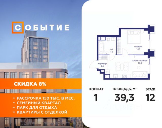 Старт продаж новой очереди! Продаётся 1-комнатная квартира общей площадью 32.97 м² без отделки в ЖК Веер на 2-м этаже 70 этажного дома. ВЕЕР.2 — это вторая очередь жилого комплекса бизнес-класса в престижном ЗАО, где реализована концепция 15-минутного города. Всё, что нужно для комфортной жизни, работы и отдыха, находится в шаговой доступности: офисный и спортивный кластеры, государственная рейтинговая школа 1329 и детский сад, центры творчества, ресторанный бульвар, фитнес и спа-центр с 25-метровым бассейном. • Архитектура и лобби ВЕЕР.2 — это ансамбль из четырёх стеклянных башен от бюро Kleinewelt Architekten, объединённых стилобатом с благоустроенным закрытым двором без машин. Моллированные окна обеспечивают максимум естественного света и ощущение простора. В каждой башне — роскошное лобби от испанского бюро Jaime Beriestain Studio: высокие потолки, обилие живых деревьев, природные материалы и палитра природных оттенков создают атмосферу Люксембургского сада прямо у вас дома. Двухуровневое гранд-лобби с коворкингом и библиотекой станет центром встреч с друзьями и соседями. В каждом лобби предусмотрены лапомойки и просторные колясочные. • Двор и инфраструктура Двор ВЕЕР.2 — это настоящий оазис северной природы: тактильная тропа, сад камней, асимметричные холмы, хвойные островки и павильон для отдыха. Для работы на свежем воздухе — бизнес-гарден, для занятий спортом — пространство для йоги и сайкла. Здесь всё продумано для поддержания гармонии в суете жизни. • Спорт и досуг Трёхуровневый фитнес и СПА-центр на 4000 кв.м с 25-метровым бассейном под прозрачной крышей, кардио- и силовыми залами, а также пространством для групповых занятий — всё это рядом с домом. • Планировки и технологии В комплексе представлены продуманные планировки: панорамные кухни-гостиные, гардеробные даже в небольших лотах, разделение на гостевую и приватную зоны, кладовые при кухнях. Малоэтажные уютные секции с 25 квартирами на этаже и с эксплуатируемой кровлей подойдут тем, кто ищет уединения. ВЕЕР.2 оснащён умной инженерией: скоростные лифты премиум-класса Sword, система считывания номеров в паркинге, гостевой Wi-Fi, приточно-вытяжная вентиляция, внутрипольные конвекторы. Безопасность обеспечивает отдельный вход для курьеров и современные системы охраны. • Парковка и сервис Для жителей предусмотрен удобный двухуровневый паркинг на 736 машиномест с прямым доступом из лобби, зарядками для электромобилей, зонами разгрузки, кладовыми и велопарковками. Купить 1-комнатную квартиру в Москве.