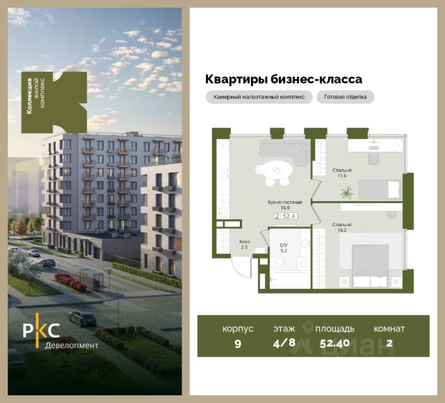 Агентам не звонить. Продается 2-комнатная квартира на 4 этаже с готовой отделкой от застройщика. В квартире будет 2 спальни, кухня-гостиная, 1 санузел, вид на парковку/поликлинику. Угловая планировка. Общая площадь 52,4 кв.м. На выбор представлены 3 вида дизайнерской отделки с использованием качественных материалов. Высота потолков 3 м. Площадь кухни 16.9 м2. "Коллекция" это камерный среднеэтажный жилой комплекс бизнес-класса в престижном экологически чистом районе Подмосковья. Прекрасная экология и живописная природа, отсутствие промышленных зон и вредных предприятий. В проекте планируется строительство 5 корпусов средней этажностью (4-8 этажей) с террасами и угловыми окнами, строительство собственной инфраструктуры: три детских сада, школа, поликлиника, физкультурно-оздоровительный комплекс. Жителям будут доступны машино-места в подземном паркинге, кладовые помещения. Ввод в эксплуатацию 3 кв. 2028г. Развитая инфраструктура: Детские площадки будут выполнены в природных материалах, игровые комплексы с бизибордами, развивающие игровые установки для игр с песком. Спортивная инфраструктура: столы для настольного тенниса, тренажеры, гимнастический комплекс. В пешей доступности находятся парк Дружба, загородный клуб "Moscow Country Club", парк имени Карбышева. Это располагает к приятным прогулкам и спокойному отдыху жителей комплекса. Транспортная доступность: 13 км от МКАД, 14 минут до МЦД-2 Нахабино, 26 минут до метро "Митино", 30 минут до метро "Пятницкое шоссе". В ближайшей перспективе - расширение местной дорожной сети и запуск новых маршрутов до ж/д станций и станций метро.