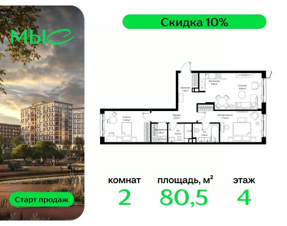 Прямая продажа от застройщика. Продаётся 2-комнатная квартира общей площадью 80.50 м² без отделки в премиальном жилом комплексе "МЫС" на 4-м этаже 12 этажного дома. Квартира расположена в корпусе "Волга". Проект МЫС — это, прежде всего, идеальное место для семей. В рамках проекта построят государственную школу, два детских сада и дворец спорта площадью 20 000 м2 с термальным комплексом, выплывным бассейном, фитнес-залом, теннисными, сквош и падел кортами и секциями для детей. На территории площадью, сравнимой с тремя парками Зарядье, появятся кафе и рестораны, пруд с набережной, спортивные и детские площадки, скейт-парк, лыжные и веломаршруты. Расположение: - 2 минуты до скоростной трассы М1 и Минского шоссе; - 10 минут до МКАД; - 15 минут до МЦД Лесной Городок - 20 минут до делового центра "Москва-Сити"; - 28 минут до аэропорта "Внуково". Благоустройство: - велосипедные и лыжные маршруты; - собственная набережная и парк; - лаунж-зоны в окружении природы; - беседки у очага; - дворец спорта площадью 20 000 м²; - термальный комплекс с тремя бассейнами; - 4 теннисных и падел-корта; - 6 сквош-кортов; - многофункциональный спортзал; - скейт-парк; - просторная площадь для прогулок с фонтаном; - детский Клуб с творческими секциями; - гастро-доминанта; - кафе у пруда, рестораны, ритейл. Окружение - соседство с лесным фондом; - школа на 1250 мест и 2 детских сада на 350 и 255 мест; - Дубковский и Подушкинский леса, парк "Рассказовка", Мещерский парк. Действуют специальные условия при 100% оплате, подробности уточняйте у менеджера в офисе продаж.