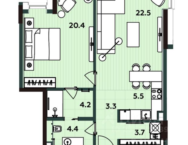 Квартира находится на 3-м этаже 9-этажного кирпичного дома. Все окна выходят на спокойную улицу, западная сторона. Планировка удобная и функциональная: кухня-гостиная, спальня с балконом, кабинет (может быть второй спальней), гардеробная и совмещённый санузел.