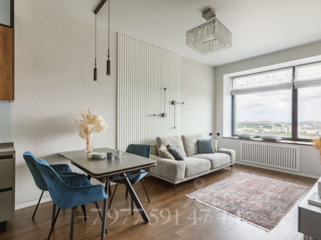 Квартира полностью готова к проживанию — здесь есть все необходимое, включая современную мебель и бытовую технику. Общая площадь квартиры 54,3 м2 (без учёта лоджии), жилая — 29,5 м2. Входная дверь Gardian. Изолированные комнаты (17 и 12,5 м2) разделены большой кухней 10,8 м2. Застекленная лоджия с выходом из кухни. Комнаты и кухня правильной прямоугольной формы, что дает возможность удобно разместить мебель. Для хранения вещей предусмотрена кладовая (гардеробная). Санузел раздельный с качественной сантехникой. В комнатах установлены сплит-системы, на полу паркетная доска, в кухне — плитка. Кухонный гарнитур со встроенной немецкой техникой Neff (варочная панель, духовка, посудомойка) и почти вся мебель остаются будущим покупателям. В подъезде 2 лифта, в т.ч. грузовой. Есть консьерж. На парковке во дворе всегда есть свободные места.