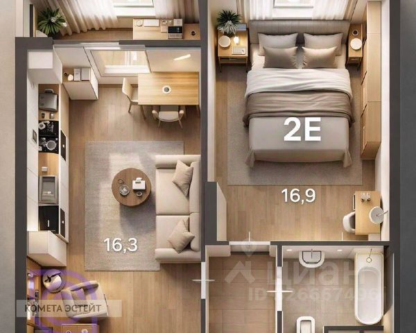 Квартира отличается функциональной планировкой, которую легко адаптировать под формат "евродвушки", потолки 3,1 м — редкий стандарт, создающий объем, много света и возможность реализации любых дизайнерских решений. Площадь: общая 43,6 м2: комната 22 м2, кухня 9,5 м2 и холл 6,7 м2, застекленная лоджия и совмещенный санузел.