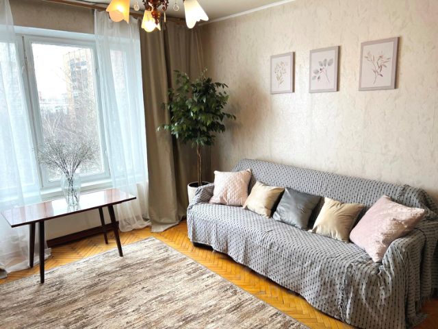 Планировка "распашонка", окна на 2 стороны: гостиная, кабинет/детская и кухня - выходят в тихий зеленый двор, спальня с застекленной лоджией на улицу.