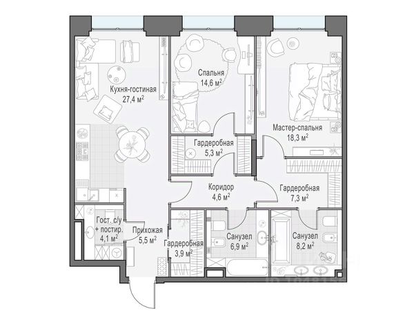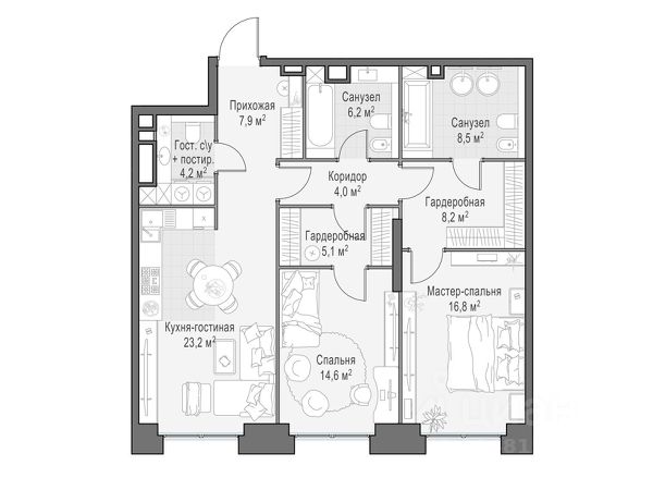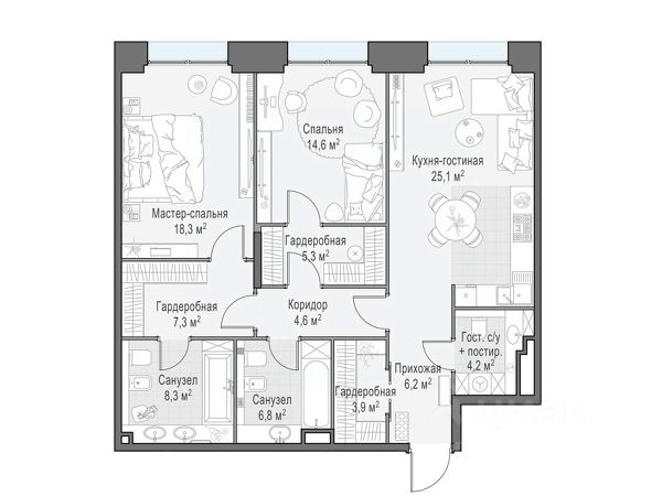 Просторная светлая квартира площадью 106,6 кв. м с окнами, выходящими в тихий приватный двор-парк с ландшафтным дизайном и на северную панораму города. Большое панорамное окно в с/у с возможностью открывания настежь улучшает видовые характеристики. Продуманная планировка позволяет разместить две спальни с отдельными санузлами и гардеробными. Life Time - роскошный современный квартал на Пресне, в наиболее быстро растущем премиальном районе ЦАО. Его насыщенная инфраструктура и выгодное расположение дарят время для жизни. Вы больше не тратите его на дорогу или ожидание, при этом ни в чём себе не отказывая. На территории предусмотрено всё для комфортной жизни: • двор-парк площадью 1,8 гектара с прудом и фонтанами; • Clubhouse - инфраструктурный центр в отдельном здании с исчерпывающими возможностями для спорта, отдыха и досуга только для жителей; • спортивная инфраструктура на улице и в помещении, в том числе бассейн длиной 25 метров, хот-таб, хаммам, сауна, бьюти-зона; • клубная гостиная с террасой; • всё для развития и досуга детей любого возраста, в том числе детский сад и школа. Life Time находится в центре сложившегося премиального района, в окружении многочисленных парков. Удобная транспортная доступность и прямой выезд на Звенигородское шоссе позволяют без проблем добраться до Садового кольца и Москва-Сити. Архитектурный стиль квартала - роскошный минимализм. Дома десятилетиями будут выглядеть современно.