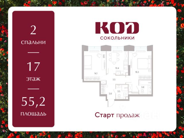 В семейном жилом квартале, расположенном в окружении более 500 га леса и объектов исторического наследия, продается 2-комнатная квартира площадью 61.2 кв. м без отделки. Квартира расположена на 2 этаже 39-этажного корпуса 2.2 жилого квартала бизнес-класса КОД Сокольники от девелопера Новая Эра. Отличная транспортная доступность - 3 мин. пешком до станции МЦД-3 "Митьково"; - 7 мин. пешком до станции метро "Сокольники"; - Удобный выезд на Русаковскую улицу; - 5 мин. на авто до ТТК; - 15 мин. на авто до Садового кольца. Продуманный архитектурный проект - Выразительная архитектура, созданная бюро "Остоженка"; - 70% квартир в квартале - видовые, что позволяет ежедневно наслаждаться панорамами на парк Сокольники, Останкинскую телебашню, исторический центр и Алексеевский монастырь; - 30% квартир - угловые. Увеличенные оконные проемы, панорамное остекление и продуманное расположение комнат усиливают эффект обзорности: гостиные и спальни получают максимум дневного света и живописные виды, которые становятся частью интерьера; - Высокие потолки от 3 метров в типовых планировках; - Дизайнерские лобби от модной студии 211.Studio; - Двухуровневый паркинг с подогреваемой рампой и пологим заездом, подходящим даже для спорткаров; Расположение Семейный жилой квартал КОД Сокольники - это дома бизнес-класса в престижном районе Сокольники. Район отличает хорошая транспортная доступность: несколько минут пешком до станции метро "Сокольники" и платформы МЦД-3 ("Митьково"), регулярные трамвайные и автобусные маршруты, удобный выезд на Русаковскую улицу и Третье транспортное кольцо. До Садового кольца можно доехать за 15 минут. Для пешеходов и велосипедистов в парковой зоне будут оборудованы широкие тротуары и велодорожки, обеспечивая комфортные условия для активного образа жизни. Внутренняя инфраструктура Резидентам будет доступна развитая клубная инфраструктура: собственный фитнес-рум, коворкинг с панорамным видом на парк, игровая комната для детей, пространства для мастер-классов и просторная гостиная, которую можно использовать для отдыха, просмотра кино или проведения мероприятий. На первых этажах жилых домов разместятся объекты стрит-ритейла: кафе, рестораны, магазины и различные сервисы - от аптек и салонов красоты до ателье и барбершопов. Рядом с жилыми корпусами появится деловой квартал с офисами и торговыми площадями на 75 тысяч кв. м, что делает проект привлекательным для тех, кто ценит возможность жить и работать поблизости. Благоустройство Центральным элементом квартала станет благоустроенный двор-парк площадью 3 га с собственным прудом и зелеными зонами для прогулок и отдыха. В границах двора предусмотрены современные игровые и спортивные площадки: мультифункциональная зона воркаута, площадки для волейбола и стритбола, площадки для пилатеса и йоги, скалодром, а также беговые и веломаршруты. В состав проекта войдет образовательный центр, включающий детский сад для 350 малышей, а также школу на 650 учеников.