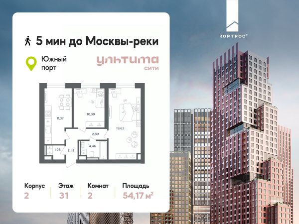 Предложение месяца от застройщика: - Скидка до 10% на ограниченный пул квартир - Рассрочка 0% на 1 год - Семейная ипотека без удорожания, ставка 4% - Ипотека для всех на весь срок, ставка 11,89% Продаётся 2-комнатная квартира от застройщика ГК "КОРТРОС" в жилом комплексе бизнес-класса УЛЬТИМА Сити. Квартира расположена на 2 этаже 52 этажного корпуса 2. Общая площадь 54,71 м². Без отделки. УЛЬТИМА Сити — жилой комплекс бизнес-класса в перспективном районе на юго-востоке Москвы. На его территории появятся 9 башен на 756 этажей, двухуровневый подземный паркинг, собственная инфраструктура, включая детский сад и школу. Всего девелопер благоустроит территорию в 2,6 га. Ближайшая станция метро — "Южный порт". Она откроется в 2028 году и будет находиться в 2-х минутах ходьбы. А прямо напротив расположится остановка водного автобуса-электрохода "Синичка". Дорога от квартала будет удобна и для автомобилистов: - до Кремля — 12 км - до МКАД — 12 км - до выезда на ТТК — 3 км - до Садового кольца — 8 км В двух корпусах первой очереди УЛЬТИМА Сити этажностью 45 и 52 реализуется 1 079 квартир с продуманными, рациональными планировочными решениями. В ассортиментной линейке представлены однокомнатные квартиры от 28,2 до 61 кв. м, двухкомнатные лоты от 44,3 до 95,4 кв. м, квартиры с тремя (71 — 115,57 кв. м) и четырьмя спальнями (106,6 — 114,97 кв. м). В экспозиции также есть квартиры с террасами, лоджиями, тремя и четырьмя санузлами, а также с функциональными нишами-кладовыми на кухнях. Запроектированы и эксклюзивные двухуровневые резиденции со вторым светом, в том числе с видом на Москву-реку, площадью от 77,7 до 141,9 кв. м. В рамках проекта запланировано строительство 9 корпусов, школы на 500 учащихся и детского сада на 225 мест. Еще будет создана продуманная инфраструктура для жителей: детские и спортивные площадки, амфитеатр для мероприятий, беседки и теплицы для садоводства, коворкинг, детский клуб и ресторан с открытой террасой. Доступ в жилой комплекс осуществляется по биометрическому контролю. Вокруг квартала будет приватная территория с видеонаблюдением и консьерж-сервисом 24/7. Лобби корпусов будут иметь двойные выходы: на улицу и во внутренний закрытый двор.