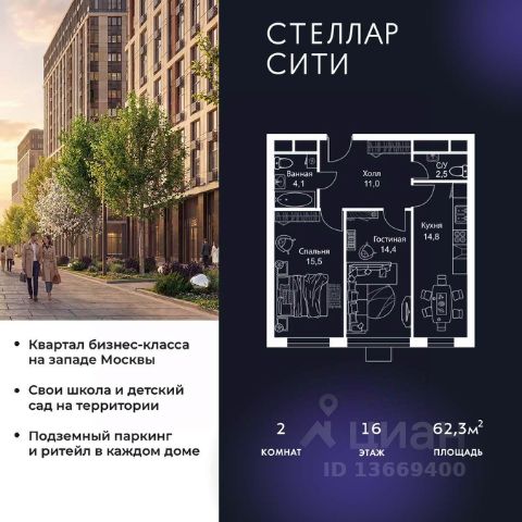 Продается квартира от надежного застройщика Tashir Estate в квартале бизнес-класса Stellar City в ЗАО Москвы. Площадь квартиры составляет: 46.7 кв. м, потолки: 3.1 м Квартира находится на 17 этаже, 4 корпуса жилого квартала Stellar City — микрогорода будущего на орбите Москвы. Stellar City — квартал в ЗАО Москвы вблизи инновационного центра Сколково. В окружении — 11 парков и природных зон, в том числе Долина реки Сетунь, Мещерский лес и парк развлечений The Rink. Город в городе Чтобы дом и инфраструктура вокруг отвечала динамичному лайфстайлу жителя мегаполиса, в основу проекта легла концепция город в городе, которая позволяет решать все бытовые вопросы in-home. В квартале будут возведены школа и детский сад, воркаут-зоны, променад, вело и беговые дорожки, детские площадки для каждого корпуса, а также коммерция на первых этажах для ежедневных покупок. Все необходимое — на расстоянии нескольких шагов. Изящные и лаконичные лобби Авторский дизайн, натуральные материалы в отделке и безупречный интерьер вне времени. Лобби и холлы в проекте бизнес-класса Stellar City ничем не отличаются от входных групп в премиум-сегменте благодаря качественным европейским материалам в отделке, стильному дизайну, консьерж-сервису и уютной зоне ожидания с журнальными столиками и мягкой мебелью. Комфорт и безопасность Закрытая территория, охрана, система СКУД, специально разработанное мобильное приложение дома для резидентов и подземный паркинг с круглосуточным наблюдением и доступом с помощью автоматического считывания номера авто.