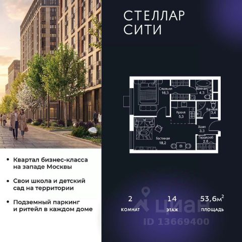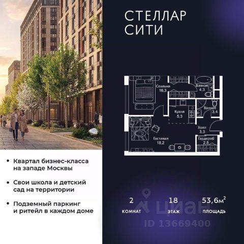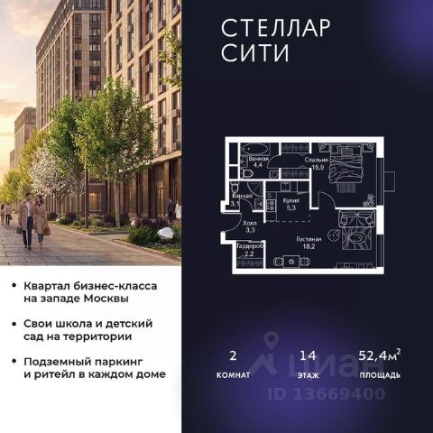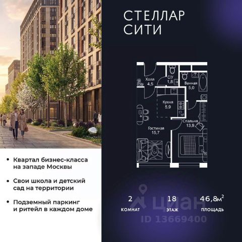 Продается квартира от надежного застройщика Tashir Estate в квартале бизнес-класса Stellar City в ЗАО Москвы. Площадь квартиры составляет: 39.5 кв. м, потолки: 3.1 м Квартира находится на 17 этаже, 4 корпуса жилого квартала Stellar City — микрогорода будущего на орбите Москвы. Stellar City — квартал в ЗАО Москвы вблизи инновационного центра Сколково. В окружении — 11 парков и природных зон, в том числе Долина реки Сетунь, Мещерский лес и парк развлечений The Rink. Город в городе Чтобы дом и инфраструктура вокруг отвечала динамичному лайфстайлу жителя мегаполиса, в основу проекта легла концепция город в городе, которая позволяет решать все бытовые вопросы in-home. В квартале будут возведены школа и детский сад, воркаут-зоны, променад, вело и беговые дорожки, детские площадки для каждого корпуса, а также коммерция на первых этажах для ежедневных покупок. Все необходимое — на расстоянии нескольких шагов. Изящные и лаконичные лобби Авторский дизайн, натуральные материалы в отделке и безупречный интерьер вне времени. Лобби и холлы в проекте бизнес-класса Stellar City ничем не отличаются от входных групп в премиум-сегменте благодаря качественным европейским материалам в отделке, стильному дизайну, консьерж-сервису и уютной зоне ожидания с журнальными столиками и мягкой мебелью. Комфорт и безопасность Закрытая территория, охрана, система СКУД, специально разработанное мобильное приложение дома для резидентов и подземный паркинг с круглосуточным наблюдением и доступом с помощью автоматического считывания номера авто.