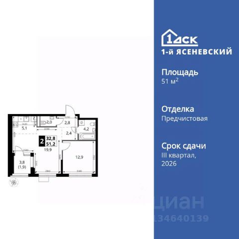 Прямая продажа от застройщика! Жилой Комплекс класса Комфорт Плюс. Продаётся 2-к квартира номер 519 общей площадью 52.9 кв.м. на 11-м этаже 18 этажного здания. Предчистовая отделка. Цена с учётом скидки. Особенности квартиры: - Квартиры рядом с метро - м. Корниловская 9 мин пешком - 63 га лесопарка за окнами - Школа c ИТ-кластером и бассейном. 2 детских сада - Организуем показ в удобное для вас время! - Линейная планировка - максимальная функциональность и удобство. - Увеличенная ширина окна/окон - больше света и визуального простора. - Раздельный санузел - больше удобства для всех членов семьи. - Можно оборудовать рабочее место - комфорт для работы и учёбы. - Просторная кухня - место для семейных ужинов и кулинарных экспериментов. - Кладовая - дополнительное пространство для хранения. - Лоджия - уютное место для отдыха и тишины. Квартира с предчистовой отделкой. Вам не придется заниматься черновыми и трудоёмкими работы, а чистовую отделку и дизайн - сделайте на свой вкус. Информация о комплексе: ЖК "1-й Ясеневский": преимущества городской инфраструктуры и природы. Пешая доступность к метро, школе с бассейном и ИТ-кластеру, а также 63 га Троицкого лесопарка под окнами. Закрытая территория с бульварами, велодорожками, кафе и дворами без машин. Фруктовые деревья и городские сады создают уникальную атмосферу. Всего в 1 км от МКАД - идеальный баланс для современной жизни. Транспортная доступность: До метро "Корниловская" - 12 минут пешком До метро "Тютчевская" - 25 минут пешком До метро "Теплый стан" - 10 минут на транспорте До метро "Ольховая" - 30 минут на общественном транспорте Личный автотранспорт: Выезд на Калужское шоссе - 500 м МКАД - 1 км Внутренняя инфраструктура: ЖК "1-й Ясеневский" - идеальное место для семей с детьми. Рядом Троицкий лесопарк для прогулок, а во дворах - современные детские площадки, разработанные с участием психологов. В шаговой доступности два детских сада и школа на 1100 мест с ИТ-кластером, бассейном и классами робототехники. Всё для счастливого детства и успешного будущего. Квартира с предчистовой отделкой - ваш дизайн без черновых работ