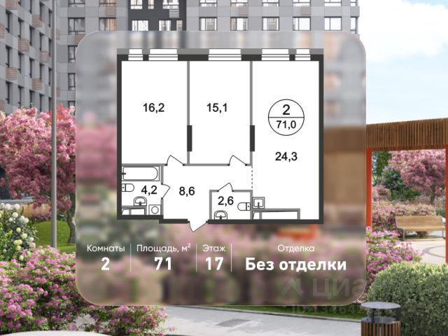 Продается двухкомнатная квартира без отделки в 11 квартале города-парка "Первый Московский". Общая площадь квартиры - 68,5 кв. м, этаж 21 из 22. Планируемый срок ввода в эксплуатацию - 1 квартал 2029 года. Тип дома - монолитный. ТОЛЬКО ДО 30 АПРЕЛЯ выгодные условия на приобретение квартиры в ипотеку или рассрочку. Звоните - и мы подберем оптимальное предложение под ваш запрос! 5 корпус состоит из 2 секций: - 1 секция - без отделки - 2 секция - с отделкой White Box Город-парк "Первый Московский" расположен всего в 7 км по Киевскому шоссе от МКАД на территории Новой Москвы. Из города-парка прямой выезд на Киевское шоссе и трассу Солнцево-Бутово-Варшавское шоссе. ТРАНСПОРТНАЯ ДОСТУПНОСТЬ: - 7 мин. на личном автомобиле или 10 мин. на автобусе до станции метро "Филатов Луг" - 10 мин. на автомобиле или 20 мин. на автобусе до станции метро "Рассказовка" или "Саларьево" ПРЕИМУЩЕСТВА 5 КОРПУСА: - живописные виды на Ульяновский лесопарк - входные группы с безбарьерным входом - просторная колясочная в каждой секции - в каждой секции - 3 лифта: 2 пассажирских, 1 грузовой - количество квартир на этаже: 1 секция - 4 квартиры, 2 секция - 5 квартир - на 1-ом этаже в секции 2 расположено коммерческое помещение - на -1-ом этаже каждой секции запроектированы кладовые помещения - обеспеченность машино-местами: гостевой паркинг 48 м/м, многоуровневые паркинги рядом с домом ВНУТРЕННЯЯ ИНФРАСТРУКТУРА И БЛАГОУСТРОЙСТВО: Дома 11 квартала граничат с Ульяновским лесопарком. Вся территория 11 квартала разделена на 2 типа: - приватное дворовое пространство с детскими игровыми и спортивными площадками. Дворы свободны от машин. - прогулочные маршруты с зонами отдыха. Прогулочный маршрут объединяет дома 11 квартала в единое пространство, за счёт оригинальной геопластики создаётся уникальный разноуровневый ландшафтный узор. РАЗВИТАЯ ИНФРАСТРУКТУРА В ОКРУЖЕНИИ: - общеобразовательная школа 2120 корпус ш3 (всего в проекте 5 школ) - детский сад 2120 корпус д4 (всего в проекте 8 детских садов) - школа искусств - поликлиника - торговый центр Столица - кафе, продуктовые магазины, аптеки, фитнес центры, салоны красоты и пр. - в пешей доступности благоустроенный парк Филатов Луг