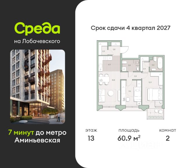 О квартире Продаётся 2-комнатная квартира общей площадью 65.2 кв.м. без отделки. Квартира расположена на 2 этаже корпуса 5.7 в жилом комплексе бизнес-класса "Среда на Лобачевского" в пешей доступности от метро "Аминьевская". О жилом комплексе "Среда на Лобачевского" полностью соответствует критериям современного жилого пространства. Взяв за основу рациональный подход, мы гармонично соединили дизайн, актуальные тренды и функциональность. Продуманный современный экстерьер и функциональные планировки внутри, приватные пространства и разнообразные досуговые зоны для каждого члена семьи — все это "Среда на Лобачевского". Инфраструктура Район отлично развит и наполнен жизнью, здесь уже есть вся необходимая инфраструктура — детские сады, школы, медучреждения, торговые центры, благоустроены парки для прогулок и отдыха, удобен и легкодоступен городской транспорт. Рядом расположены учебные корпуса крупных университетов — МГУ, МГИМО и РАНХиГС. Школы и детские сады в районе занимают высокие позиции в городских рейтингах, поэтому вам не придется беспокоиться о качестве образования детей. Как и об отдыхе: поблизости расположены живописные пруды, реки и парки. Это Парк Олимпийской деревни, Парк имени 50-летия Октября, Мещерский парк и Очаковские пруды. Теперь поставить галочки в еженедельном чек-листе "спорт-прогулки-встречи с друзьями" можно, не покидая любимый район. Особенности Особое внимание в проекте уделяется созданию функциональных пространств не только внутри дома, но и за его пределами. В ландшафтном парке "Среды на Лобачевского" расположены крытые зоны для спокойного времяпровождения, места для активного отдыха и спорта, коворкинг, соседский комьюнити-центр, водные объекты. —Ландшафтный парк во дворе. —Водный сад с зонами отдыха. —Зоны коворкинга. —Дизайнерские гранд-лобби. —Бесключевой доступ. —Подземный паркинг.