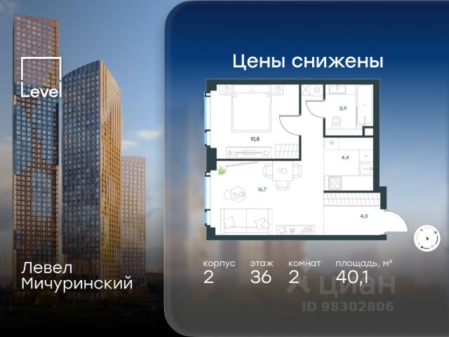 Цена указана с учётом скидки при 100%-й оплате, несубсидированной ипотеке, рассрочке (кроме программы "Рассрочка 0%"). В жилом квартале, расположенном на границе с природным заказником "Долина реки Очаковки", продаётся 2-комнатная квартира площадью 55.50 кв.м без отделки. Квартира расположена на 45 этаже 54-этажного корпуса 1 в жилом комплексе бизнес-класса Левел Мичуринский (компания Level Group/Левел групп). Отличная транспортная доступность: - от 10 мин. пешком до станции метро "Мичуринский проспект" - 15 мин. пешком до станции метро "Аминьевская" - 7 мин. на авто до МКАД - 10 мин. на авто до ТТК - 15 мин. на авто до Москва-Сити Продуманный архитектурный проект: - Выразительная архитектура от известных бюро: корпуса 1-6 - бюро СПИЧ, корпуса 7-13 - архитектурное бюро Анатолия Борисова; - Из окон открываются живописные виды на парки, Москва-Сити и МГУ; - Высокие потолки до 6,35 м; - Стильные лобби с окнами в пол и высокими потолками до 4,7 м; - С каждого этажа дома на лифте можно спуститься в подземный отапливаемый паркинг. Расположение: Жилой комплекс Левел Мичуринский строится в одном из самых зелёных районов Москвы - Очаково-Матвеевское. Этот уголок столицы идеален для поддержания здорового образа жизни. В шаговой доступности от проекта находятся заказник "Долина реки Очаковки" - 1 мин. пешком и Очаковский парк - 7 мин. пешком. На велосипеде можно добраться до таких парков, как "Событие", парк Олимпийской деревни, парк 50-летия Октября и парк Школьников. В 15 минутах езды на авто расположено более 30 детских садов (из них 14 в пешей доступности), 32 школы (из них 13 в пешей доступности) и 14 вузов. Также в ближайшем окружении - более 25 медицинских учреждений, 11 спортивных клубов и 22 продуктовых супермаркета. Внутренняя инфраструктура: На территории жилого комплекса строится три детских сада и школа. На первых этажах домов откроется супермаркет, фитнес-центр, ресторан, кафе и другие сервисы. Подземные этажи займут паркинги: трёхуровневые - в этапах 1 и 2, одноуровневый - в этапах 3 и 4. Преимущества проекта: - 4,5 га благоустроенной территории с видовым мостом, уличным кинотеатром, зонами для тихого отдыха, работы, уличных тренировок, площадки для петанка, футбола, настольного тенниса и пляжного волейбола. - Дизайнерские лобби с панорамным видом на двор, мойками для лап животных и комфортными зонами ожидания. - Безопасность жителей: круглосуточное видеонаблюдение всех зон общего пользования (лобби, лифты, паркинги, детские площадки), система контроля доступа, управление видеодомофоном через мобильное приложение, единый ключ доступа на территорию жилого комплекса. - Технологии и комфорт: высокоскоростной вайфай в лобби и на придомовой территории, автоматическая система контроля и учёта ресурсов, абонентская связь с консьержем, распознавание номеров автомобилей при въезде в паркинг и выезде из него.